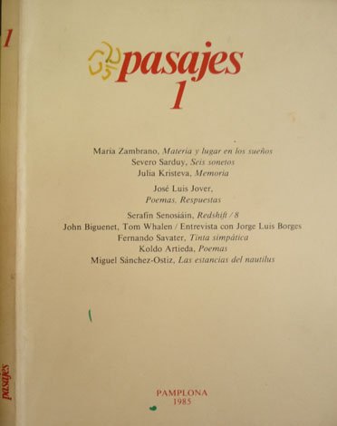 Pasajes. Revista de literatura, dirigida por Miguel Sánchez - Ostiz y Serafín Senosiain. Número 1. María Zambrano: Materia y lugar en los sueños; Severo Sarduy: Seis sonetos; José Luis Jover: Poemas: Fernando Savater; Tinta simpática: Miguel Sánchez - Ostiz; Las estancias del nautilus, y otros textos.