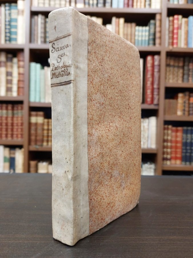 <span style="font-style: normal;">In-12° (cm. 18), legatura coeva in mezza pergamena e titolo manoscritto al dorso; pp. [8] 316 in ottimo stato, in barbe (lievissime e sporadiche fioriture e leggerissima brunitura uniforme). Prima edizione per nulla comune di un'opera innovativa per la storia della medicina, ove l'autore integra la riflessione epistemologica di Wolff, tentando tra i primi di classificare le malattie da un punto di vista biologico. Questo geniale saggio sfocerà poi nell'ulteriore suo corposo lavoro </span><i>Nosologia methodica</i> (Amsterdam 1763). Ottimo esemplare. (SB1)