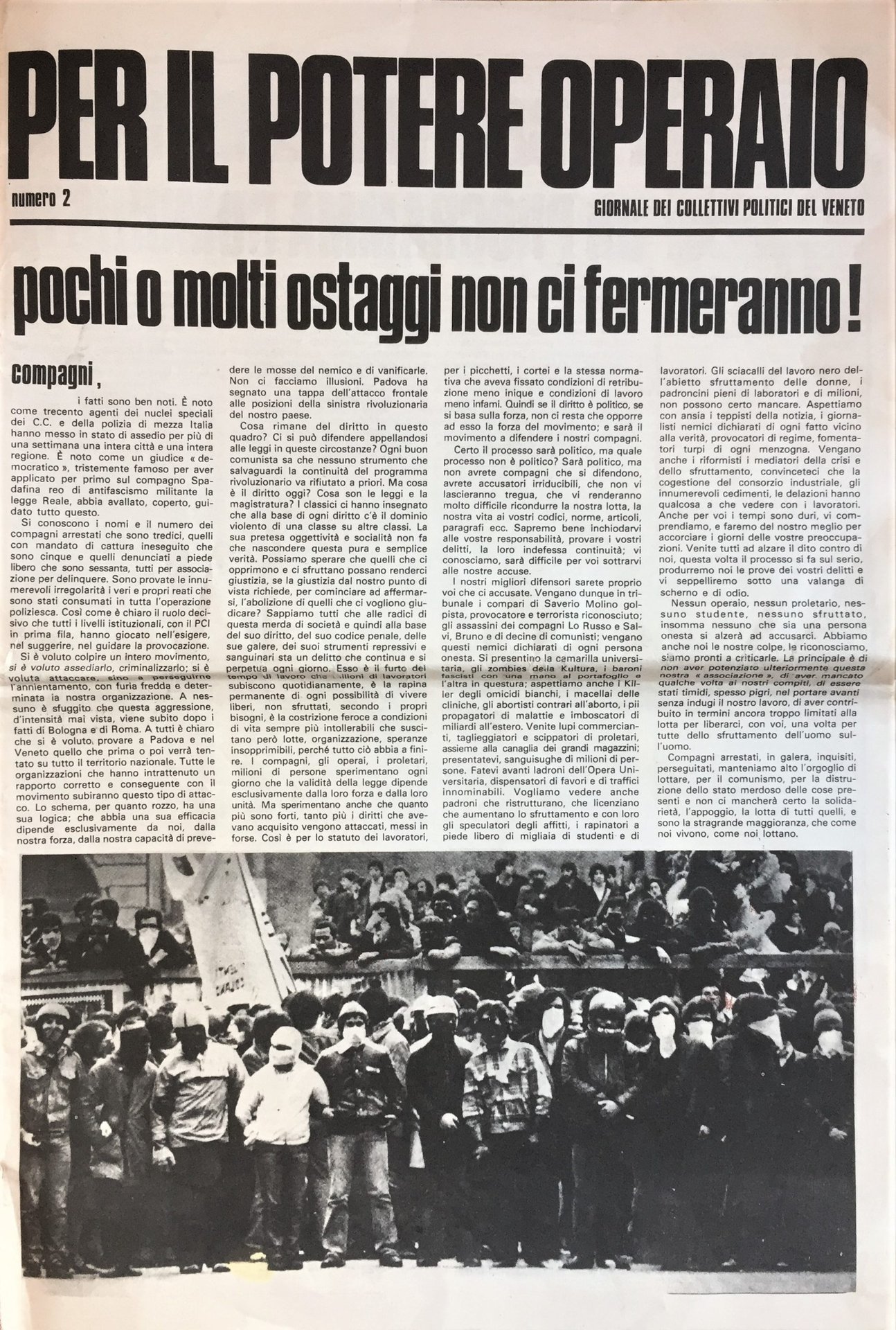 Nati dalle ceneri di Potere Operaio, prima come Collettivi politici Padovani, dal '76 diventano Collettivi Politici Veneti (CPV), un'organizzazione rivoluzionaria che farà della lotta armata la sua strategia, ma con una sostanziale divergenza dalla linea delle Brigate Rosse: l'illegalità doveva essere di massa e il partito armato mai clandestino. Si trattano i temi del rifiuto del lavoro, della disoccupazione, della fabbrica diffusa, con un documento del Fronte Comunista Combattente. Nel settembre '77 nascerà un'esigenza di maggior organizzazione per cui la redazione confluirà nella rivista "Rosso", che prenderà il sottotitolo "per il potere operaio". Questo numero esce come supplemento a "Rosso". Secondo dei due numeri della rivista pubblicati. In ottimo stato.