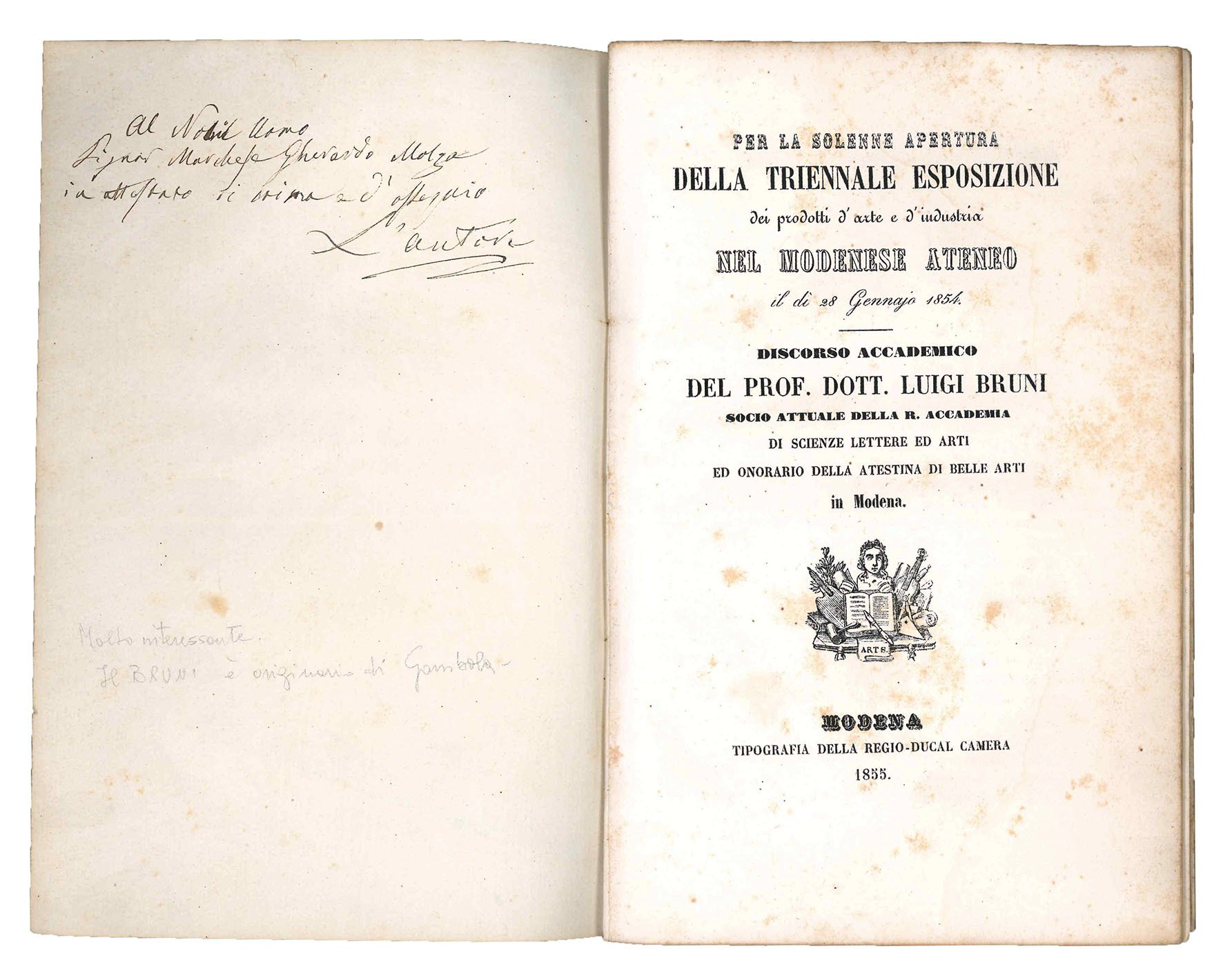 Per la solenne apertura della triennale esposizione dei prodotti d'arte e d'industria nel modenese ateneo il di 28 gennaio 1854. Discorso accademico del prof. dott. Luigi Bruni [...]. | Rare and modern books | BRUNI, Luigi (1802-1882)