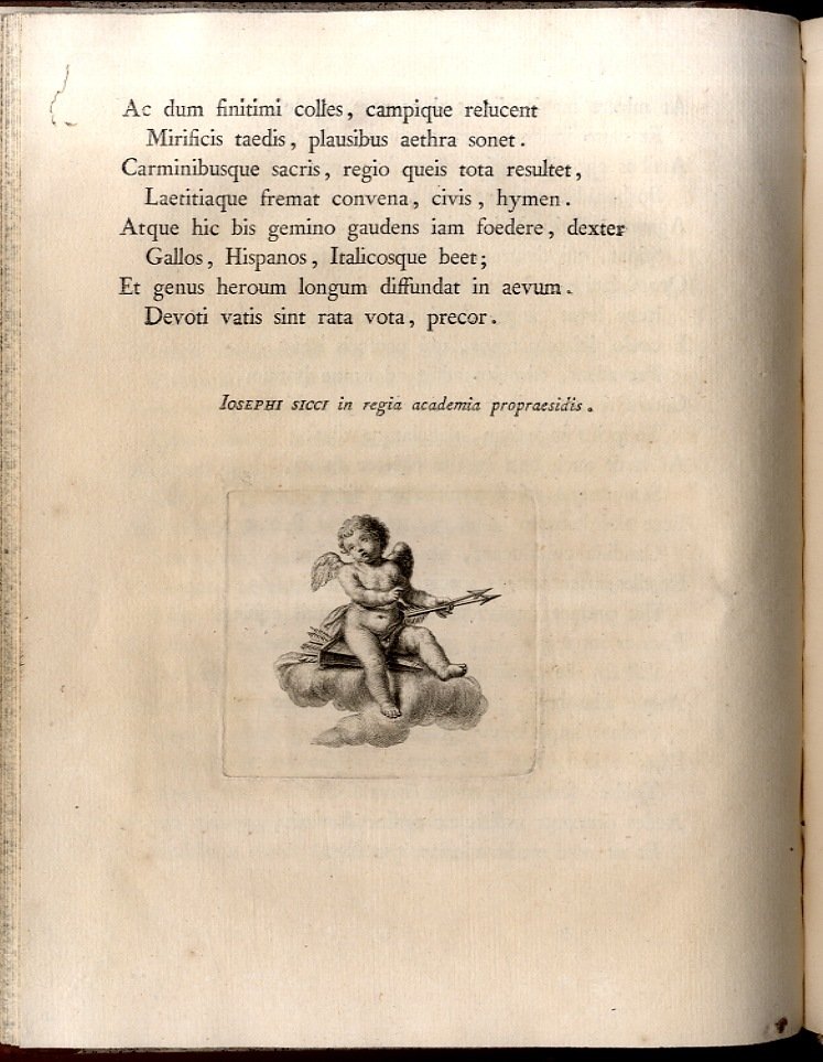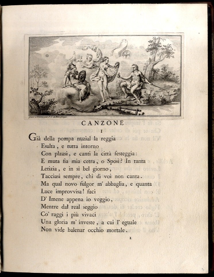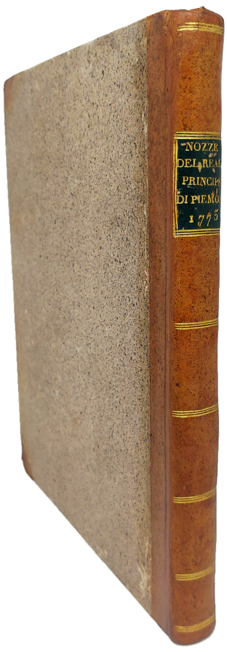 >In-4, ff. (72 non num.), legatura del tempo in mezza pelle con angoli, titolo su tassello e filetti in oro al dorso. Il volume, dono dagli associati della Stamperia Reale, contiene canzoni, sonetti, odi in latino e in italiano, qui raccolte in occasione delle nozze tra la principessa Clotilde di Francia e il futuro Carlo Emanuele IV. Il volume si apre con due tavole incise: la magnifica antiporta raffigurante i due sposi entro medaglione retto da putti, incisa dal Betti, e il frontespizio allegorico inciso a Vienna da Reinsperger. Bella carta forte, impressione nitida, ampi margini e nel testo altre due vignette sempre incise su rame. Un piccolo lavoro di tarlo al margine di 6 carte, ottimo per il resto. Alla sguardia ex libris alle armi di casa Savoia.