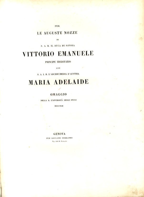 >in-folio, pp. 30 (in alcuni esemplari inserito ritratto qui mancante), bella legatura coeva romana in marocchino blu con triplice cornice concentrica (due con impressioni vegetali in oro ed una a secco), al centro dei piatti armi araldiche dei Savoia e degli Asburgo sormontate da corona, sguardie in seta rosa. L'opera comprende una dedica introduttiva del Conte Giuseppe Alborghetti e tra gli altri versi celebrativi della contessa Enrica Orfei, Agostino Chigi, Muzzarelli, Visconti, Tommaso Borgogno… Ottimo esemplare di non comune opera, censita in una decina di Biblioteche pubbliche italiane.
