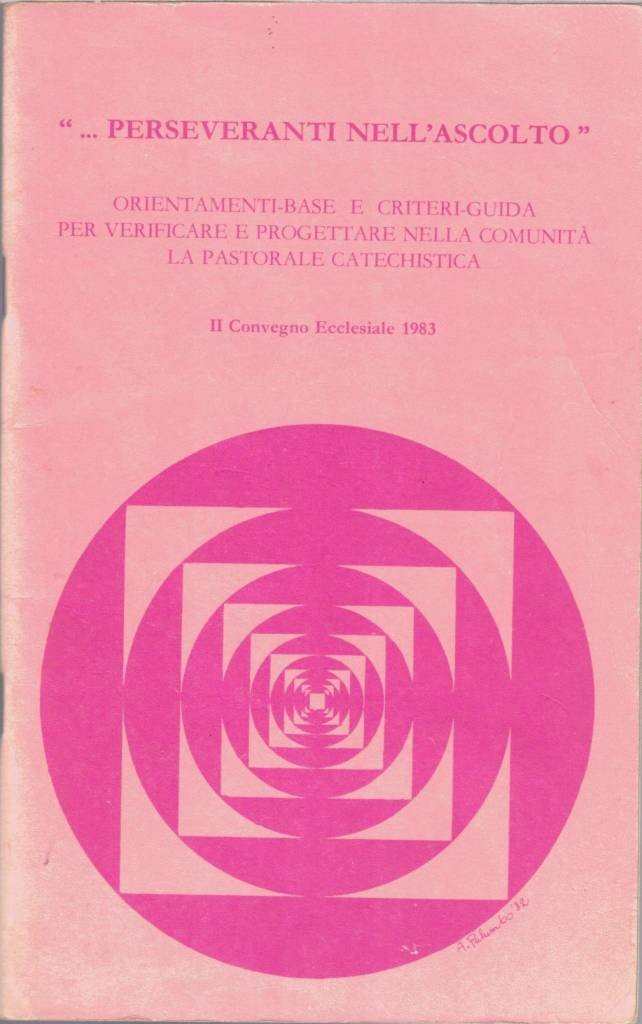 … perseveranti nell’ascolto. Orientamenti-base e criteri-guida per verificare e progettare nella comunità la pastorale catechistica. II Convegno Ecclesiale 1983, Ecumenica Editrice,Bari 1982, pp. 65, cm 21, pubblicazione spillata. Leggere tracce d’uso, per il resto buona copia. Raro.