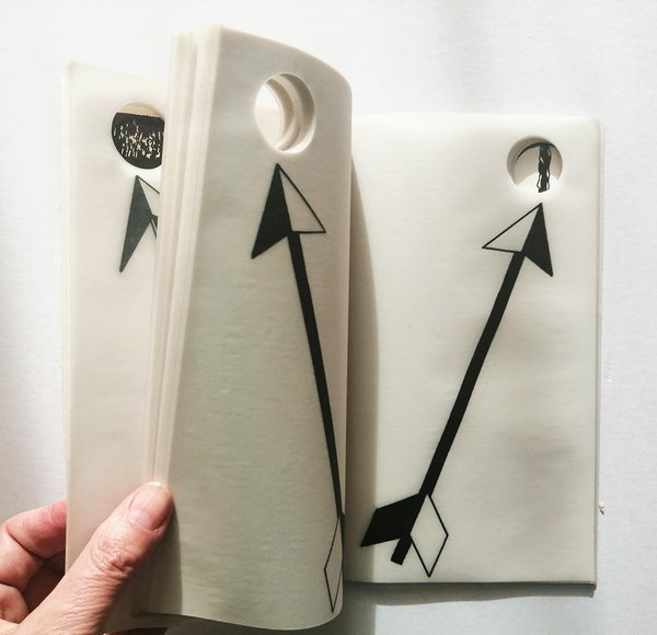 formato 21X12. LIBRO D ARTISTA composto da una copertina in brossura e molte pagine in carta da lucido con una freccia e un foro circolare che attraversa tutto il libro. Prima edizione. Bella copia. FINE CONDITION