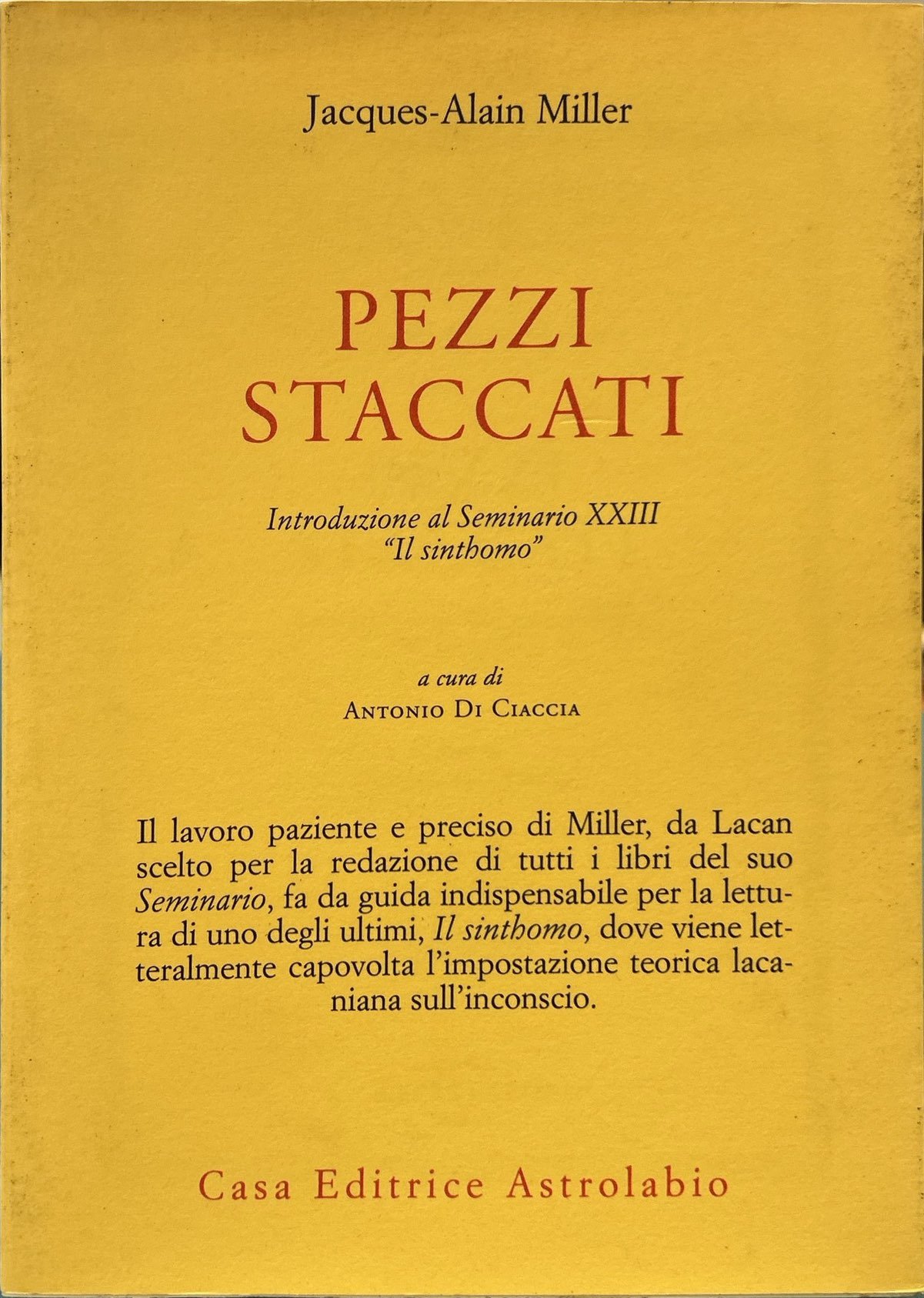 In questo libro Jacques-Alain Miller fa da guida al lettore che si accosta all'ultimo insegnamento di Lacan. Sicuramente il più arduo. Il libro XXIII del Seminario di Lacan, intitolato Le sinthome - antica grafia del termine sintomo - e infatti, come tutti gli ultimi seminari, completamente diverso dai precedenti. Perché? Almeno per due motivi. Primo: perché Lacan nell'ultimo periodo del suo insegnamento capovolge letteralmente la sua impostazione teorica sull'inconscio. Mentre prima l'accento era posto sull'assioma che l'inconscio è strutturato come un linguaggio, ora Lacan mette l'accento sulla disgiunzione tra il senso e il reale, tra la verità e il godimento. L'accento non è quindi posto sul sistema significante, sul grande Altro, sul linguaggio, ma sul godimento, che è quel reale che si presenta clinicamente come impossibile da sopportare e logicamente come senza senso. Addirittura il significante stesso non serve più alla comunicazione o al senso, ma si rivela essere al servizio del godimento, come prova l'opera di Joyce, soprattutto Finnegans Wake. Inoltre questo seminario presenta in modo del tutto diverso la triade che aveva guidato Lacan fin dagli inizi del suo insegnamento l'immaginario, il simbolico e il reale - e con cui aveva riorganizzato la teoria e l'esperienza della psicoanalisi. // Qualche macchia e fioritura alla sovraccoperta e ai tagli ma in generale in buone condizioni