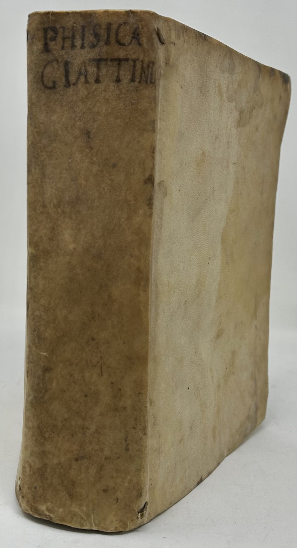 >in-4 (mm. 220x160), pp. (8), 649, (i.e. 653, 43; numerosi errori di paginazione tra cui la ripetizione della numerazione delle pp. 447-448 e 462-463); leg. coeva in p. pergamena, titolo ms. in inchiostro bruno al dorso. Monogramma a stampa al titolo della Compagnia di Gesù.; iniziali, testatine e finalini silogr, alcune figure n.t. Prima edizione dell'opera di Giovanni Battista Giattini, studioso e professore gesuita di origine palermitana (1600-1672), composta secondo la forma tradizionale del commento ad Aristotele suddiviso in sedici questioni. L'opera ha finalità metafisico-teologiche ma con interesse per i temi scientifici allora maggiormente in voga (infinito attuale, vuoto e indivisibili). Bell'esemplare a pieni margini (lievi gore d'acqua nel margine inferiore delle prime pagine). DBIt, LIV, pp. 617-619. Narbone III, 50. Riccardi I, 602.