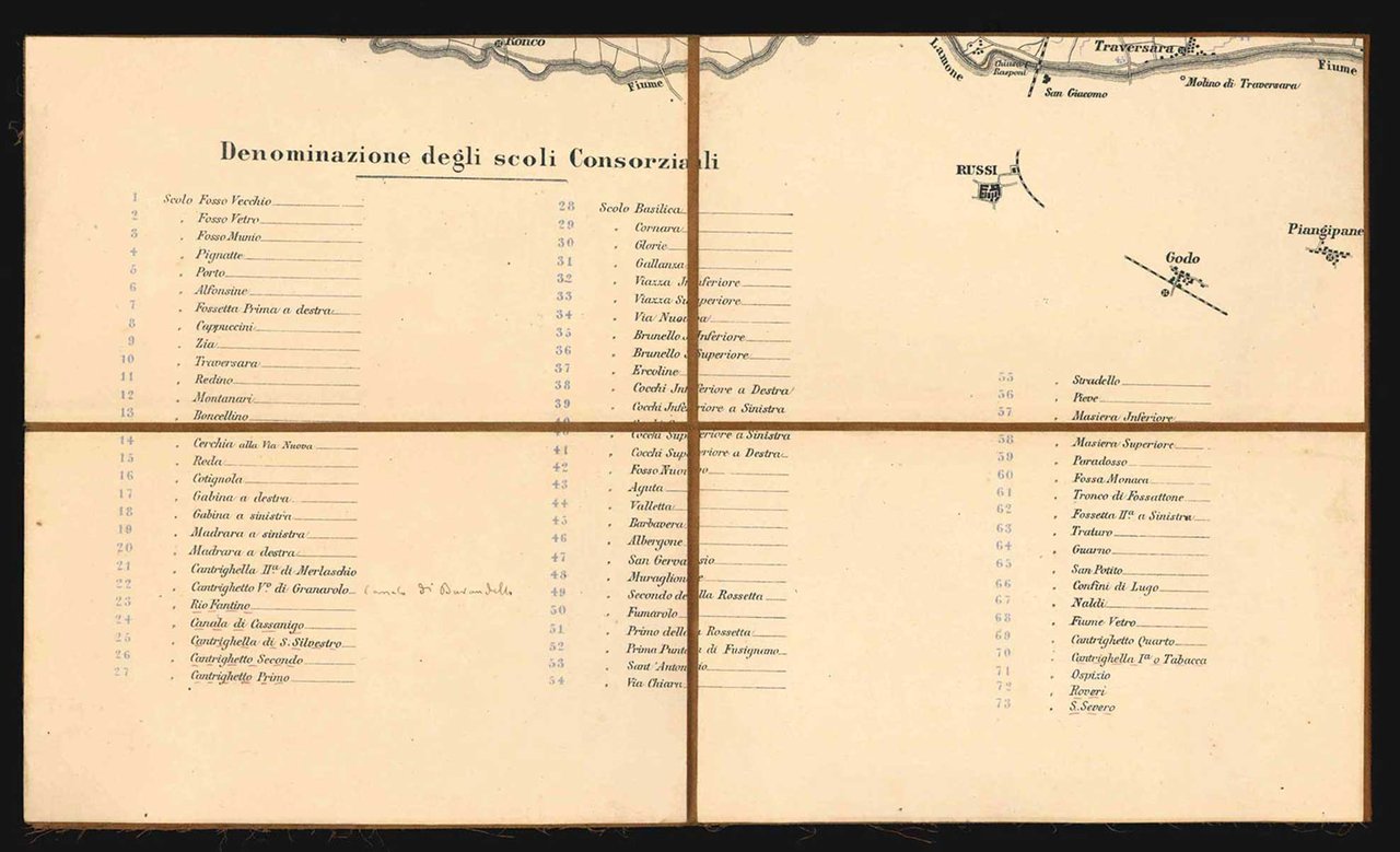 EPHEMERAOttime condizioni.La carta illustra il canale di scolo che da Faenza tocca Bagnacavallo, Alfonsine e altre città della provincia. Sono elencate e indicate sulla pianta, anche le denominazioni degli scoli Consorziali