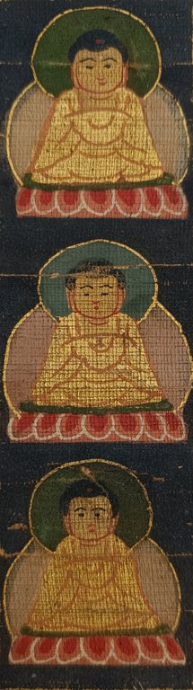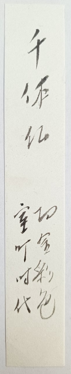 Testo manoscritto a lato "I mille corpi del Buddha". inchiostro su seta grezza cm. 3,1 x 12,4 Buono (Good) Buon es..