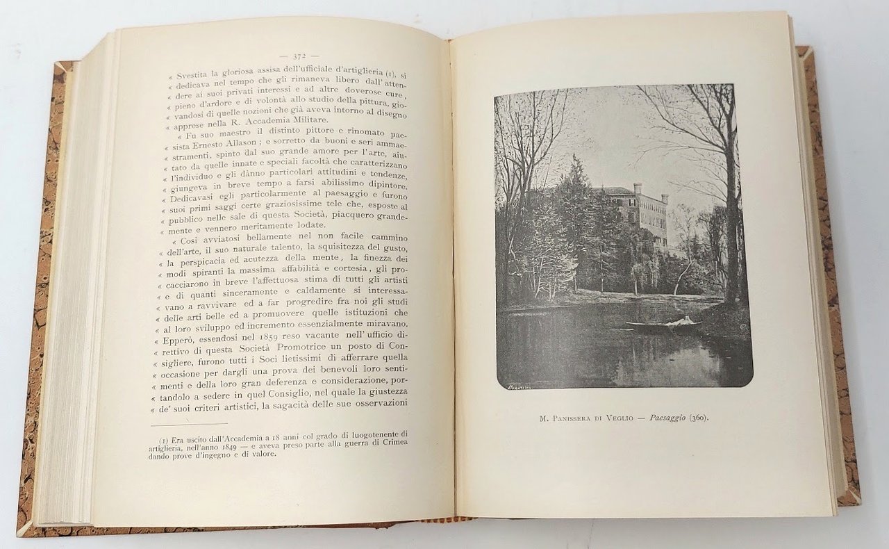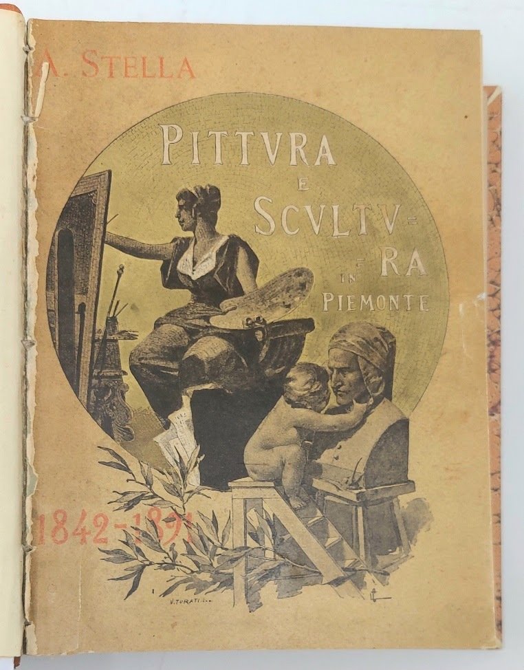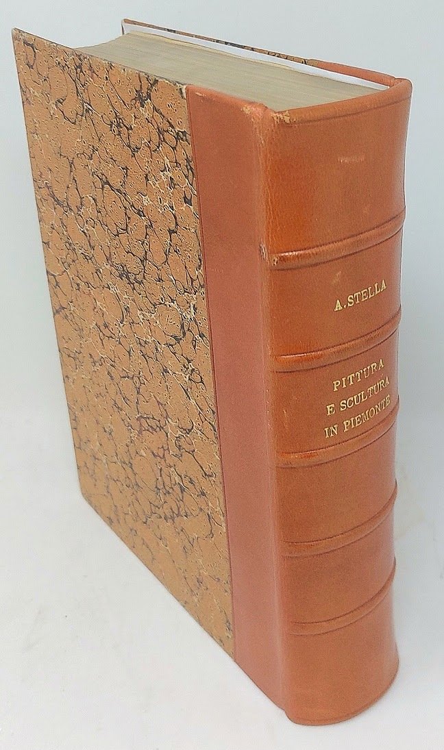 >in-8, pp. XIV, (2), 667, bella e solida leg. m. pelle, tit. e fregi oro al dorso, brossure editoriali figurate a colori conservate. Con una tav. f.t. (medaglia con effigie di Carlo Alberto inc. da G. Carrel) ed un gran numero d'illustr. n.t., molte delle quali a p. pag., graziose testatine ed iniz. fig. ed ornate. Monografia di fondamentale interesse per le preziose notizie bio-bibliografiche che fornisce su oltre 200 artisti piemontesi del secondo Ottocento. Divenuta rara e ricercata. Ottimo esemplare.