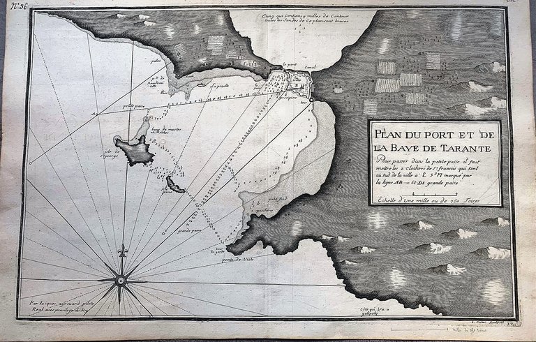 Tratta dall' atlante nautico "Recueil de plusieurs Plans des Ports et Rades et de quelques Cartes particulières de la Mer Méditerranée, avec les figures des Terres remarquables pour les reconnoissances des Atterrages", edito tra il 1732 ed ll 1746. Jacques Ayrouard, idrografo francese, risulta attivo tra il 1730 ed il 1750; il raro atlante dei porti del Mediterraneo rimane la sua unica opera. Questo atlante nautico sarebbe stato successivamente disegnato da numerosi idrografi, in particolare William Heather che cita Ayrouard nel suo “New Mediterranean Pilot” del 1802. L'incisore, Louis Corne, è noto a Tooley esclusivamente da questo lavoro. Bell'esemplare in buono stato di conservazione, numerata a mano nell'angolo superiore sinistro, qualche piccola macchietta rossa. The Map Collector, Issue 24, p.49.