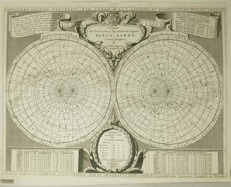 >Incisione in rame (mm 465x615), su carta forte vergellata, tratta da "Corso geografico universale" (1688-92). Raffigurazione dei due emisferi settentrionale e meridionale della volta celeste, con sei cartigli: i due centrali contengono la dedica a Marco Bembo e lo stemma e la tabella delle grandezze; quello in alto a sinistra riporta una sintesi della rappresentazione cartografica celeste da Tolomeo in avanti. In alto a desta il cartiglio contiene osservazioni sulla variazione di longitudine della stella di terza grandezza dall' epoca di Timocaride a quella di Copernico. In basso i cartigli con le tabelle del moto di Longitudine delle stelle fisse secondo Ticone e secondo Riccioli. Ottimo stato di conservazione.