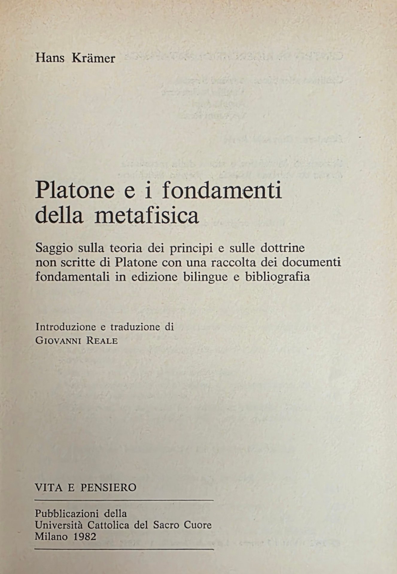 PLATONE E I FONDAMENTI DELLA METAFISICA. SAGGIO SULLA TEORIA DEI PRINCIPI E SULLE DOTTRINE NON SCRITTE DI PLATONE CON UNA RACCOLTA DEI DOCUMENTI FONDAMENTALI IN EDIZIONE BILINGUE E BIBLIOGRAFIA