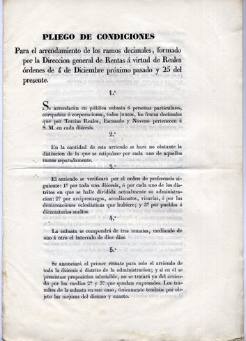 Pliego de Condiciones para el arrendamiento de los Ramos Decimales, formado por la Dirección General de Rentas a virtud de Reales órdenes de 4 de Diciembre próximo pasado y 25 del presente.