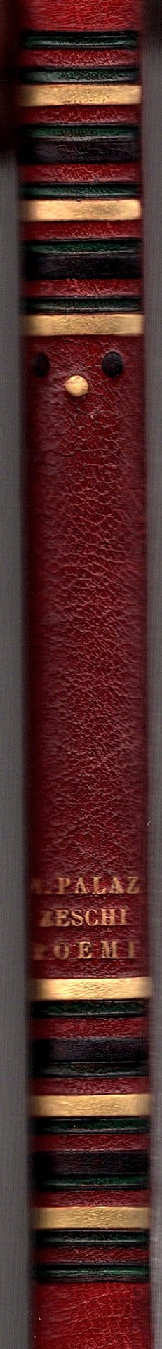 In-4° (27x20 cm), elegante legatura (di poco posteriore) in mezza pelle con titoli dorati al dorso ornato con motivi geometrici policromi in rilievo e in cavo, piatti e sguardie carta marmorizzata. Conservati i piatti della brossura editoriale con titoli in rosso e disegno b/n al tratto dell'autore. Pp 148, (2), stampate in rosso e nero. Ottimo esemplare in barbe. Rara edizione originale di questa autoedizione (tiratura di 250 esemplari) di 46 poesie e 1 poemetto. Cfr. Gambetti-Vezzosi, p. 609.