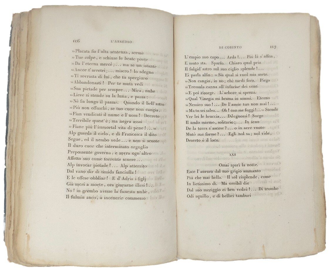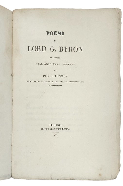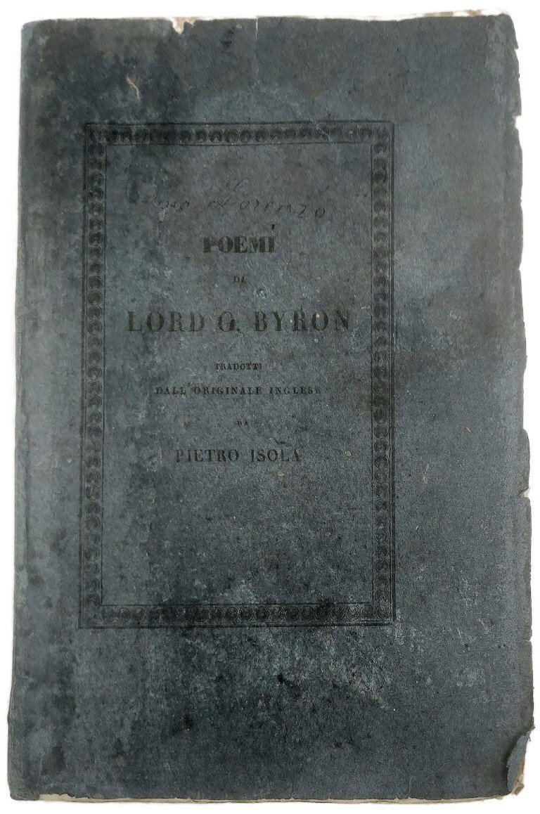 >in-8 (220x140 mm), pp. 204, (4), brossura editoriale originale (polverosa e con segni d'uso). Esemplare nella prima variante, con dedica del tradutorre all'avvocato Isola. Prima traduzione italiana, pubblicata postuma. Le opere presenti, Il prigioniero di Chillon, Parisina, L'assedio di Corinto, Lara, sono tradotte in versi sciolte e talvolta precedute da dediche (alla contessa Ottavia Masino-Giglio di Mombelli, a Luigi Richeri e a Gabriella Bonvicino Goffi). Buon esemplare, in barbe (qualche macchietta qua e là).