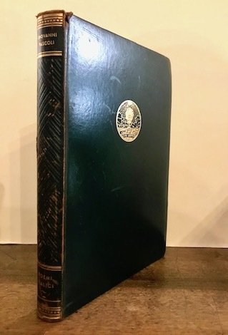8vo (cm. 23,3), XIII pp., 1 c.nn., 243(1) pp., 2 cc.nn. Legatura editoriale in pelle verde con fili, fregi e titoli oro al ds. (piccoli difetti alla cuffia superiore). Un medaglione impresso in oro con la sigla pascoliana ‘sub arbuto’ al piatto anteriore. Edizione a tiratura limitata e numerata di 999 esemplari (nostro n. 729). Buono stato di conservazione.