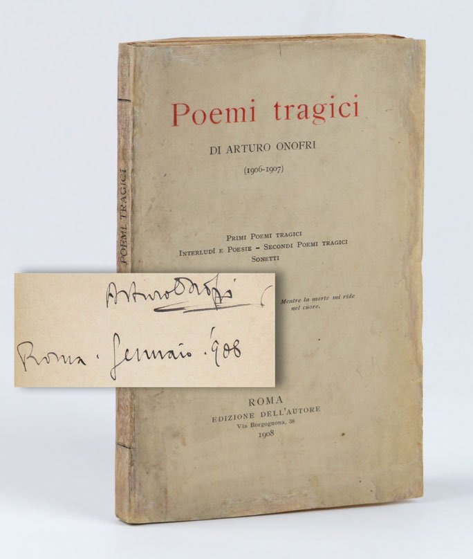 LIBROEdizione originale.CON AUTOGRAFO.Esemplare con invio autografo assolutamente coevo («gennaio. ’908») dell’autore alla prima carta (destinatario rimosso e bordo superiore della carta ripristinato con restauro); restauri ai bordi e al dorso copertina originale in brossura, che è molto rara a trovarsi ancora conservata.Opera seconda stampata a proprie spese, molto rara.