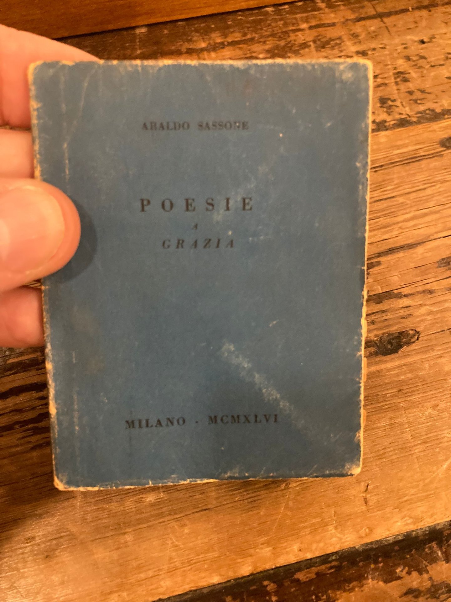 In-24° (10x8 cm), pp. (28), brossura editoriale incamiciata blu con titoli in nero. Serie Letteraria. Lievi sbiaditure e segni del tempo ai piatti, firme di possesso alla carta bianca anterirore e al frontespizio ma più che buon esemplare (N°89/450). Edizione originale di questa suite poetica.