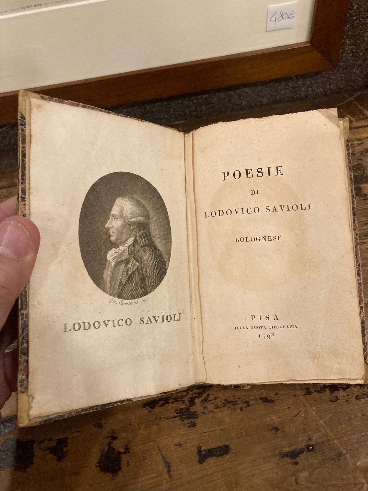 In-16 (16x10 cm), pp. (6), 112, legatura coeva mezza pergamena rigida, titolo dorato sui tassello al dorso. Ritratto del Savioli al controfrontespizio. Dedicatoria a stampa degli editori 'alla cittadina di Parnasso e di Gnido Teresa Pallavicini Lomellino. Più che buon esemplare. Edizione pisana di questa raccolta di rime amorose del Savioli (Bologna, 1729-ivi, 1804). L'opera, composta da ventiquattro canzonette anacreontiche, di cui 12 già pubblicate con il titolo di Rime nel 1758, apparve per la prima volta nel 1765 e fu in seguito più volte ristampata, anche dal Bodoni. Con arte squisita di cesellatore, l'autore dipinge scene di vita settecentesca (la passeggiata, la villeggiatura, la toeletta etc.), impreziosendole con eleganti intarsi mitologici, quasi in un sottile gioco speculare tra antico e moderno. Fra le composizioni piu' espressive figura 'Il Furore', dove il Savioli rappresentò i tormenti causati dalla gelosia, e 'All'Aurora', in cui spicca una viva ammirazione preromantica per le bellezze della natura.