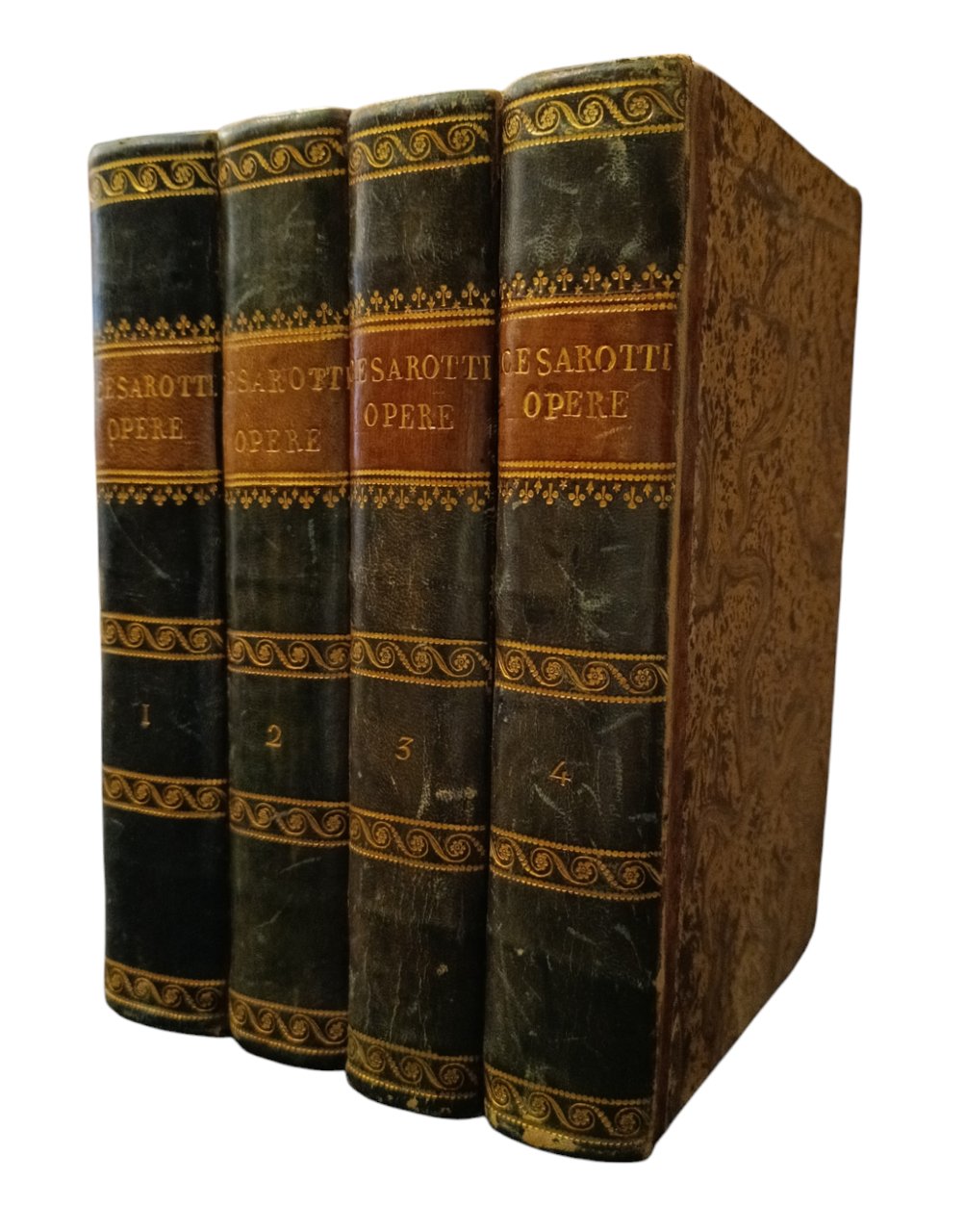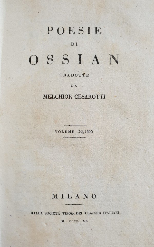 Voll. 1, 2, 3: "Opere di Ossian tradotte da Melchior Cesarotti".Vol. 4: "Saggi sulla filosofia delle lingue e del gusto di Melchior Cesarotti" cui si aggiungono "Il ragionamento sopra il diletto della tragedia" e "La lettera di un padovano al celebre signore Abate Denina". 1 tav. con ritratto di Cesarotti incisa all'acquaforte da Giovanni Boggi. in ottavo leg. in mezza pelle, titolo in oro su tassello, fregi al dorso, tagli spruzzati 4 voll.: pp. XLVIII, 378, (2); pp. 269, (3); pp. 414, (2); pp. 432, (4) Buono (Good) Buon es..