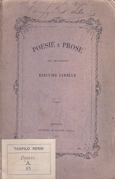 In-8°, pp. 84, (1), brossura editoriale violetta con titolo entro bordura ornamentale al piatto. Dedica autografa dell'autore al piatto anteriore alla famiglia di Teofilo Rossi ed etichetta con segnatura della privata biblioteca dello stesso Rossi. Bell'esemplare con qualche fioritura lieve. La raccolta comprende fra l'altro versi in morte di Alessandro Manzoni, un poemetto ispirato al Tasso e ad Eleonora d'Este, una poesia per nozze ed un racconto, 'Lodovina'. Il Candelo, nativo di Racconigi, fu professore a Dogliani e lasciò, come altre opere a stampa, un 'Compendio di geografia' (1883) e una raccolta di 'Varietà scientifiche e letterarie' (1884).