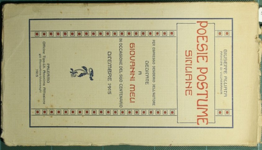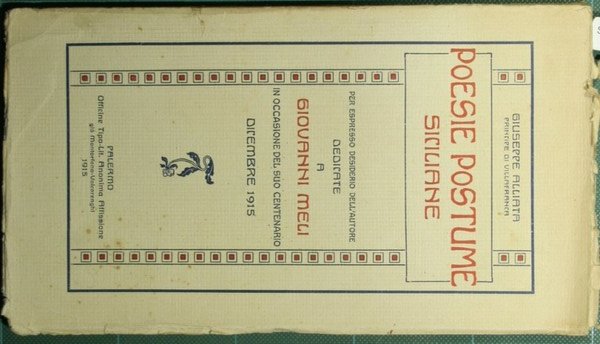 Per espresso desiderio dell'Autore dedicate a Giovanni Meli in occasione del suo centenario - Dicembre 1915 - in 8° - pp.108 - Brossura editoriale
