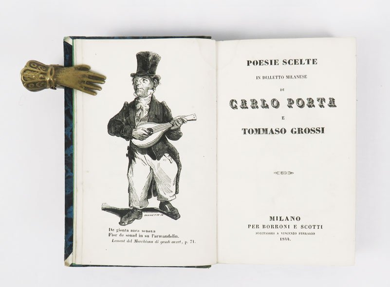 LIBROPrima edizione Borroni Scotti. Ottimo esemplare (leggero alone alla testa del margine interno delle prime carte; sporadiche fioriture molto lievi), molto fresco (155 x 95 mm).Importante edizione “commerciale”, emblematica testimonianza del grande successo di Porta a questa altezza cronologica, ormai considerato un autore “di punta” dalle grandi case editrici: la ditta Borroni Scotti nel 1837 aveva infatti acquisito la tipografia di Vincenzo Ferrario (uno dei primi e più importanti editori di Porta) e, con un investimento cospicuo di capitali e tecnologia, si era affermata come primo editore milanese per quantità di titoli immessi sul mercato: proponeva un’ampia selezione di testi di respiro nazionale, molti dei quali si imporranno rapidamente nel canone risorgimentale (cfr. M. Colummi Camerino, Archeologia del romanzo, Milano, Franco Angeli, 2016). Il ritratto del Marchionn è realizzato da Barinetti, quello di Porta è condotto sul disegno di Longhi. Bibliografia Braidense, n. 20.