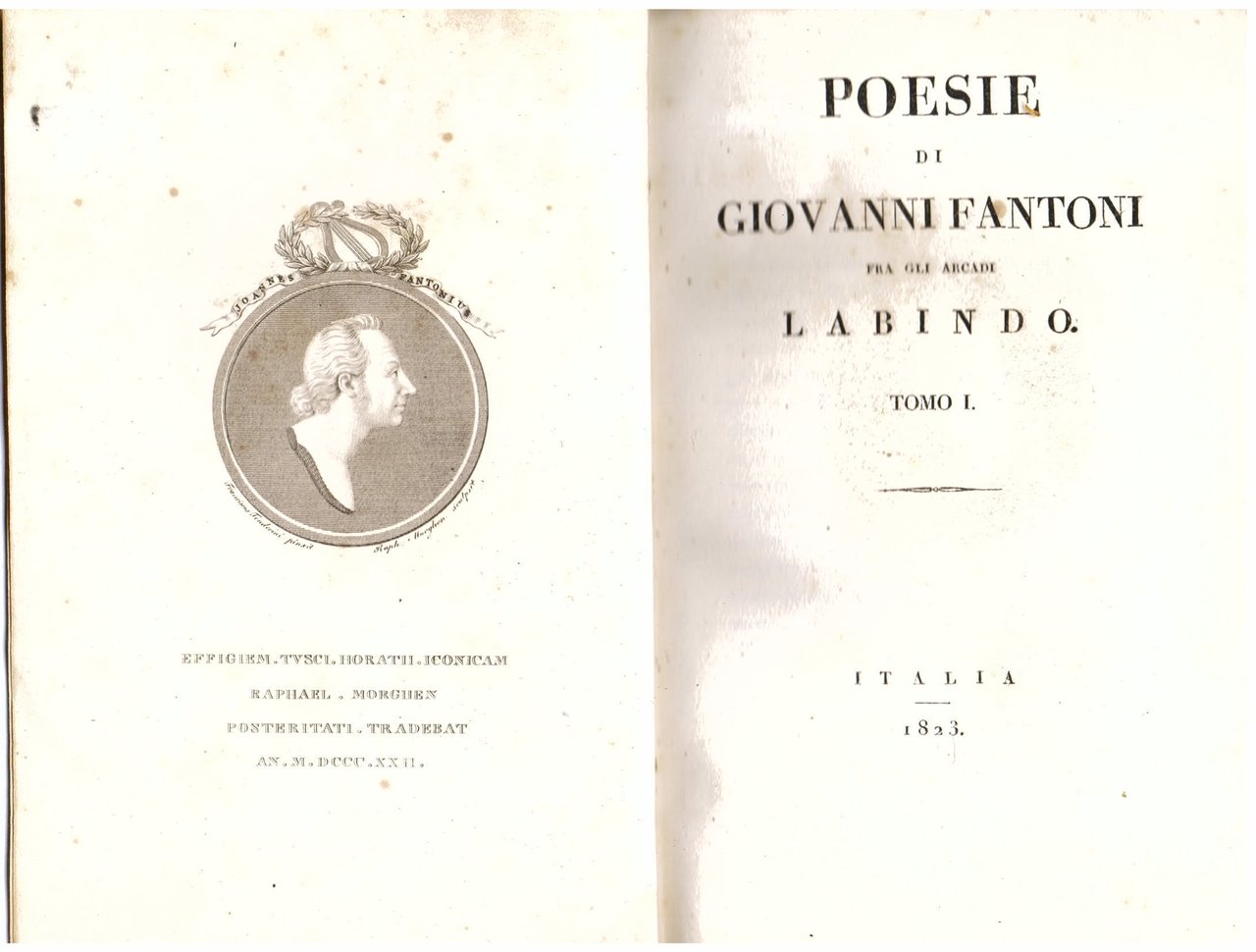 3 volumi in 4° piccolo di cm. 22,5, pp. iv, 354 (2); (2) 316 (2); (2) 325 (3). Bel ritratto dell'autore inciso all'antiporta del primo volume. Solida ed elegante legatura ottocentesca in mezza pegamena con punte. Dorsi a nervi con filetti in oro e titoli su tasselli. Esemplare genuino, marginoso ed in eccellente stato di conservazione. Bell'edizione di questa vasta opera poetica del poeta ed accademico Fantoni, fra gli arcadi Labindo (Fivizzano, 1755-ivi, 1807), letterato a suo tempo notissimo, membro dell'Arcadia e della Crusca. Il Carducci, uno dei suoi massimi estimatori (nonché imitatore di alcune sue forme metriche), dette di lui questo giudizio: 'Il Fantoni, oltre all'ingegno vivace e l'animo alacre, e un'immaginazione di movimento lirico, aveva cultura varia e moderna. Era insomma un letterato alla moda, riproduceva in un italiano incipriato di gallicismo la galanteria delle prose francesi di società: deduceva nell'Arcadia nostra canora le cupaggini enfatiche dello Young, che pareano profondità di passione, e morbidezze di Gessner, che pareano naturalità di sentimento, un po' dietro le orme del Bertola, ma con versi più andanti e sonanti. Nelle Odi era oraziano. Odorava la rivoluzione; eppur tra una genuflessione e l'altra, abitudine di educazione, naturalissima nei contemporanei di Voltaire e di Diderot, a qualche sovrano, era già di massime e aspirazioni repubblicane'. Cfr. Gamba 2585.