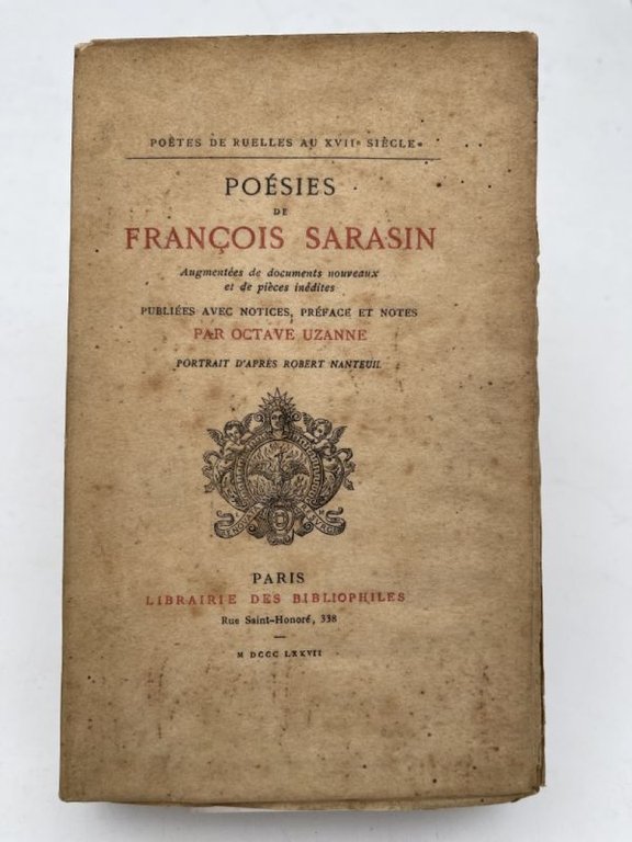 Librairie des bibliophiles 1966 Paris, Librairie des Bibliophiles, 1877. In-12 broché, couverture rempliée. XLIV + 281 pages. Augmentées de documents nouveaux et de pièces inédites publiées avec notices, préface et notes par Octave Uzanne. Portrait d'après Robert Nanteuil. Frontispice par Monziès. Tirage limité à 517 exemplaire. Collection Poètes de ruelles au XVIIe siècle. Rousseurs pâles en couverture, intérieur très frais.