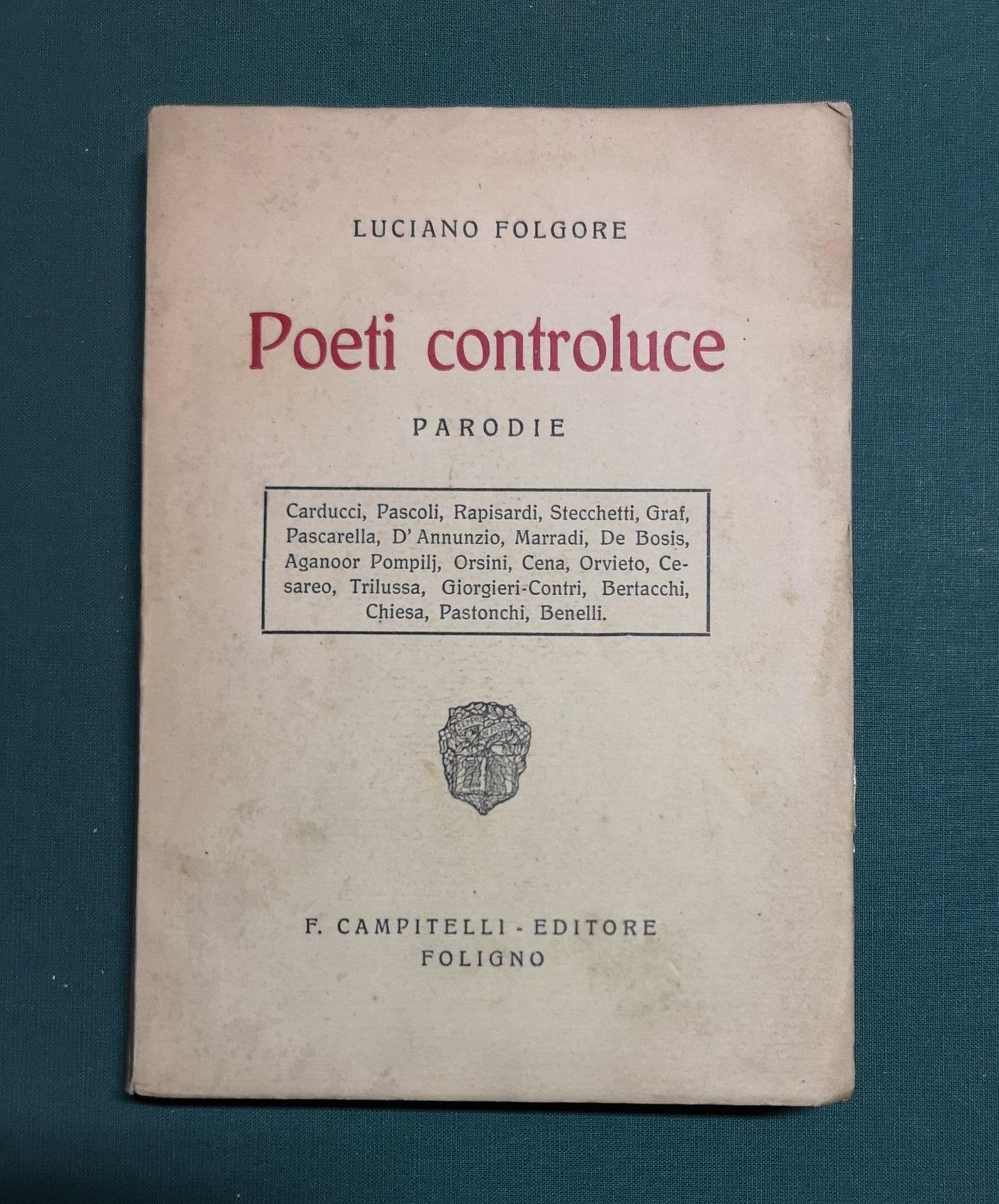 >in-8, pp. (4), 120, brossura editoriale con titolo in rosso e nero. In barbe, in ottimo stato. Edizione originale. Parodie di Carducci, Pascoli, Rapisardi, Stecchetti, Graf, Pascarella, D'Annunzio, Marradi, De Bosis, Aganoor Pompilj, Orsini, Cena, Orvieto, Cesareo, Trilussa, Giorgieri-Contri, Bertacchi, Chiesa, Pastonchi, Benelli. Il volume è testimonianza eloquente della straordinaria capacità improvvisativa e mimetica della lirica di Folgore, al secolo Omero Vecchi (1888-1966). Spaducci, p. 128. Gambetti / Vezzosi, p. 348. Cammarota, Futurismo, 208.16