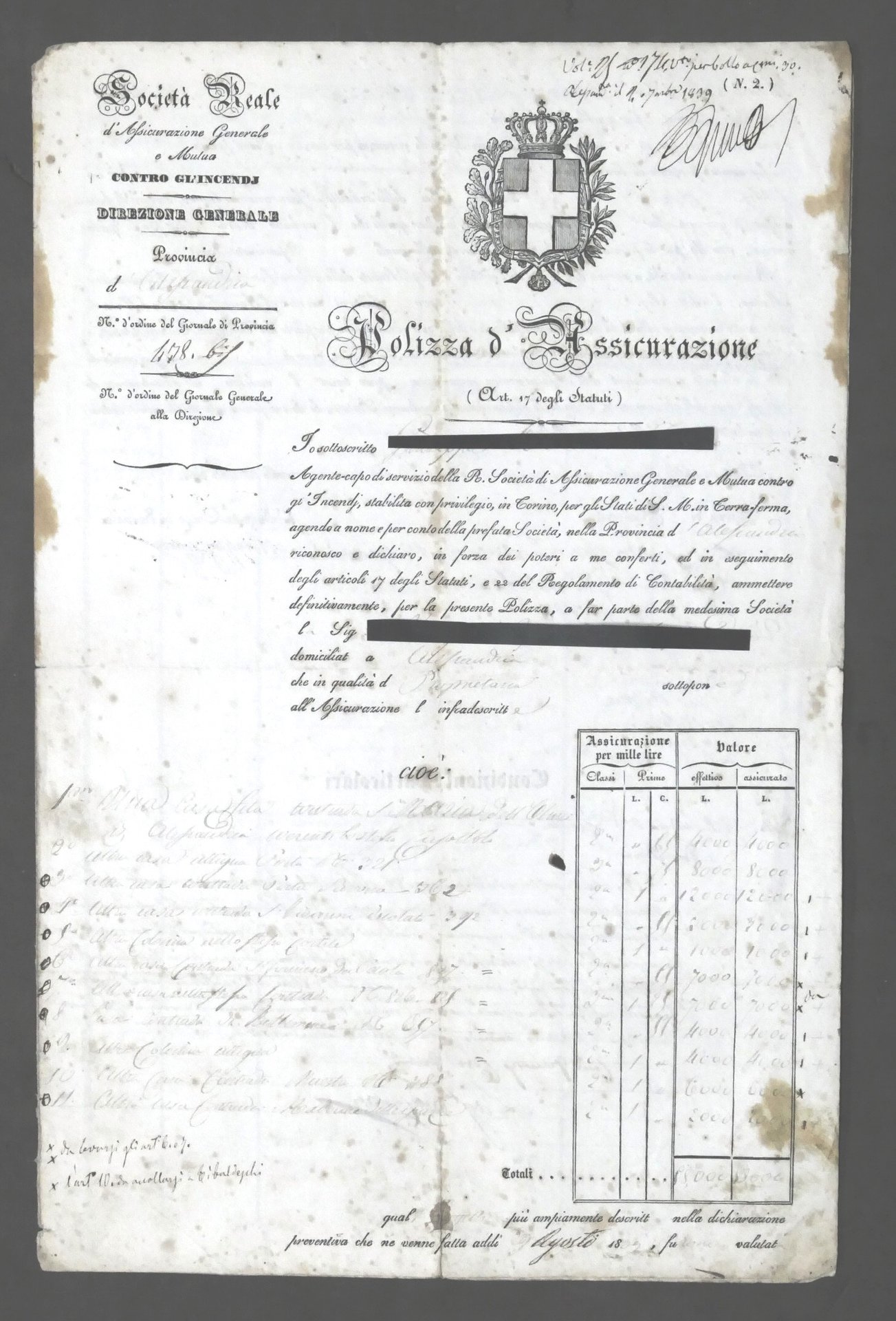 Società Reale di Assicurazione Generale e Mutua contro incendi - Provincia d'Alessandria - polizza d'Assicurazione - Anno 1839 Pag. 4 Lingua italiana. Dimensioni: 24 x 37 cm ca. Condizioni generali buone. Qualche segno del tempo come da foto.