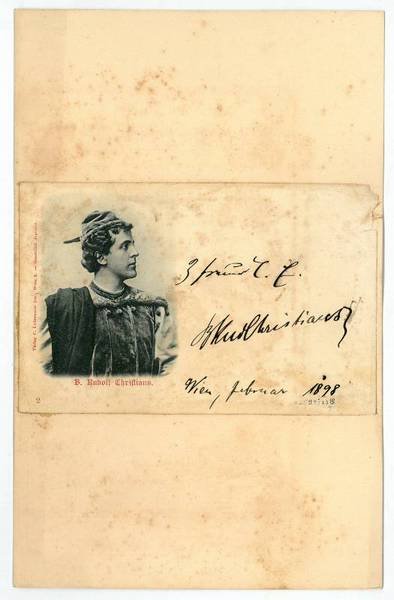 1 S. Qu.-8vo. auf Trägerkarton. Brustbild des Schauspielers. "Z. freundl. E.". - Etwas fleckig. - Rudolf Christians schloß sich, ohne jemals Unterricht erhalten zu haben, 1887 einer reisenden Schauspielergesellschaft an. Nach mehreren Reisen mit verschiedenen Wandertruppen kam er 1891 nach Krefeld und erhielt im Jahr darauf als jugendlicher Held und Liebhaber ein Engagement am Stadttheater Basel. Später war er in Düsseldorf, am Deutschen Volkstheater in Wien und am Kgl. Schauspielhaus in Berlin engagiert; seit 1906 am Neuen Theater Berlin tätig, spielte er daselbst den Hamlet, den Egmont und Richard III. und gab zahlreiche Gastspiele, die ihn an die meisten deutschen Bühnen, wiederholt nach St. Petersburg und schließlich 1913 in die USA führten, wo er das deutschsprachige Irving Place Theatre in New York leitete.