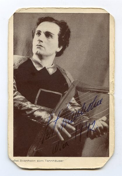 1 S. 8vo. Im Rollenkostüm aus "Tannhäuser". - Svanholm debütierte 1930 als Silvio in Leoncavallos "Bajazzo" als Bariton an der Königlichen Oper Stockholm. Sechs Jahre später debütierte er im Tenorfach, ebenfalls an der Königlichen Oper Stockholm, als Radames in Giuseppe Verdis "Aida". Seit 1938 an allen großen Opernbühnen in Europa tätig, wurde er nach Ende des Zweiten Weltkriegs für elf Jahre Mitglied der Metropolitan Opera in New York. 1956 kehrte er nach Schweden zurück und wurde Direktor der Königlichen Oper in Stockholm. - Mit kleinen Randläsuren.