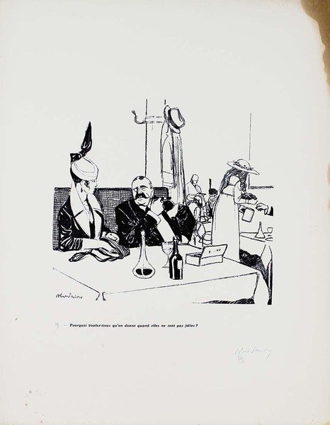 Abel Jules Faivre (Lione 1867 - Nizza 1945) Litografia originale firmata a mano dall'artista.Dimensioni: 56 x 38,5 cmCon certificato di autenticità C.O.A.Ingiallimento laterale come da foto.Esemplare numero 62/250 La raccolta di litografie umoristiche del caricaturista francese Abel Faivre (Lione 1867-Nizza 1945), andata a confluire nel volume Jours de guerre,fu pubblicata in due tomi tra il 1915 e il 1919. Con il procedere del conflitto, l'opinione pubblica di tutti i paesi coinvolti,che aveva dapprima affrontato tale evento con ottimismo, mutò rapidamente opinione sino a considerare la guerra, senza mezzi termini,come un avvenimento rovinoso. In tale contesto, le vignette satiriche di guerra possedevano un potente effetto catartico,adempivano un ruolo sociale irrinunciabile, fornendo una valvola di sfogo all’incombere dal più cupo pessimismo. Abel Jules Faivre (Lyon 1867 - Nizza 1945) Originale Lithographie vom Künstler von Hand signiert.Abmessungen: 56 x 38,5 cmMit Echtheitszertifikat C.O.A.Seitliche Vergilbung wie auf dem Foto.Kopieren Sie die Nummer 62/250 Die Sammlung humorvoller Lithographien des französischen Karikaturisten Abel Faivre (Lyon 1867-Nizza 1945), die in den Band Jours de guerre floss,es wurde zwischen 1915 und 1919 in zwei Bänden veröffentlicht. Im Verlauf des Konflikts wurde die öffentliche Meinung in allen beteiligten LändernWer dieses Ereignis anfangs mit Optimismus konfrontiert hatte, änderte schnell seine Meinung, um den Krieg ohne Zweifel zu betrachten.wie ein ruinöses Ereignis. In diesem Zusammenhang hatten die satirischen Kriegskarikaturen eine starke kathartische Wirkung.Sie erfüllten eine unverzichtbare soziale Rolle und bildeten ein Entlastungsventil gegen den dunkelsten Pessimismus. Abel Jules Faivre (Lyon 1867 - Nice 1945) Lithographie originale signée à la main par l'artiste.Dimensions: 56 x 38,5 cmAvec certificat d'authenticité C.O.A.Jaunissement latéral comme sur la photo.Copie numéro 62/250 La collection de lithographies humoristiques du caricaturiste français Abel Faivre (Lyon 1867-Nice 1945), qui allait se fondre dans le volume Jours de guerre,il a été publié en deux volumes entre 1915 et 1919. À mesure que le conflit progressait, l'opinion publique de tous les pays impliqués,qui avait d'abord fait face à cet événement avec optimisme, a rapidement changé d'avis pour envisager la guerre, en termes non équivoques,comme un événement ruineux. Dans ce contexte, les caricatures de guerre satiriques ont eu un puissant effet cathartique,ils remplissaient un rôle social indispensable, fournissant une soupape de décharge du pessimisme le plus sombre. Abel Jules Faivre (Lyon 1867 - Nice 1945) Original lithograph signed by hand by the artist.Dimensions: 56 x 38.5 cmWith certificate of authenticity C.O.A.Lateral yellowing as in the photo.Copy number 62/250 The collection of humorous lithographs by the French caricaturist Abel Faivre (Lyon 1867-Nice 1945), which went to flow into the volume Jours de guerre,it was published in two volumes between 1915 and 1919. As the conflict progressed, public opinion in all the countries involved,who had initially faced this event with optimism, quickly changed his opinion to consider the war, in no uncertain terms,like a ruinous event. In this context, the satirical war cartoons had a powerful cathartic effect,they fulfilled an indispensable social role, providing a relief valve from the darkest pessimism.