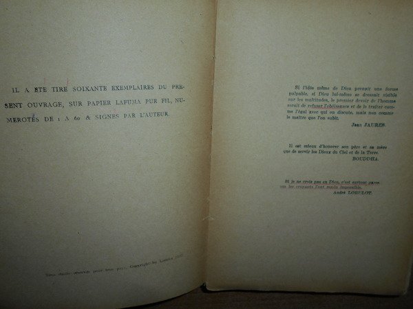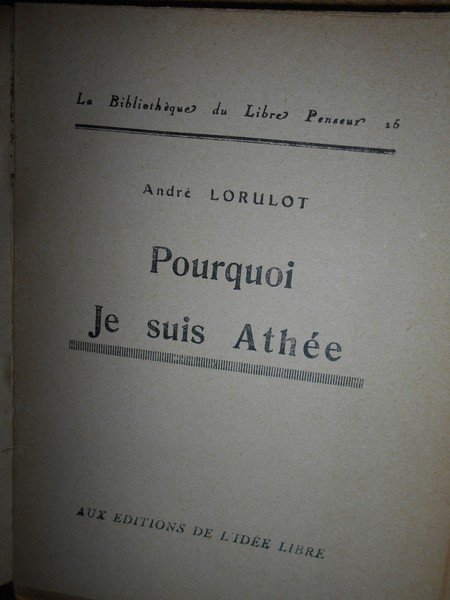 André, Lorulot. France, 1933. Pourquoi je suis athée. Préface par Han Ryner. In-16° grande, br. orig. 231, (5) pp. Ben conservato con alcune sottolineature a matita colorata in poche pagine. Tiratura molto limitata. Neg. esot. mob. 100 entro busta trasp.