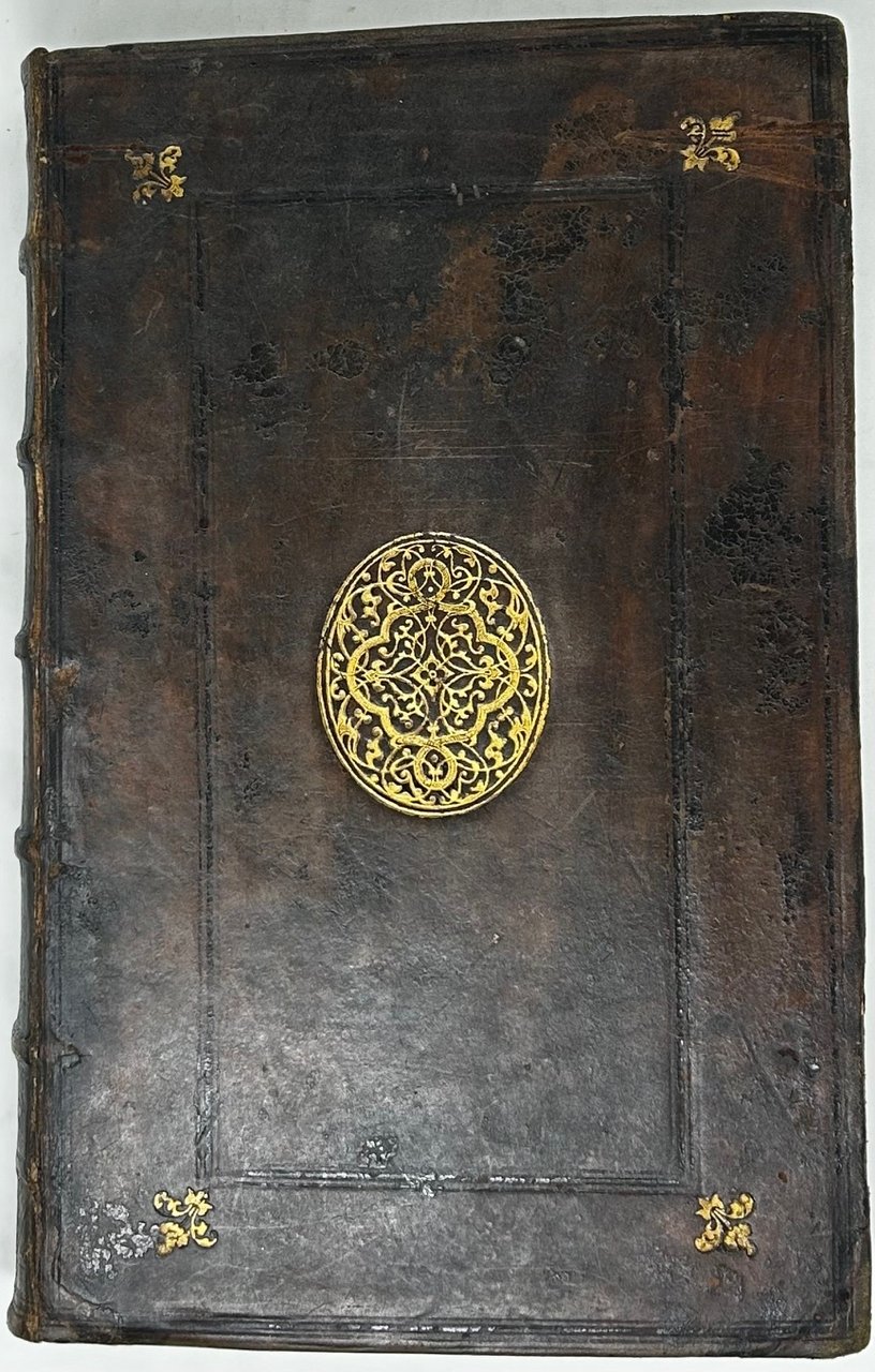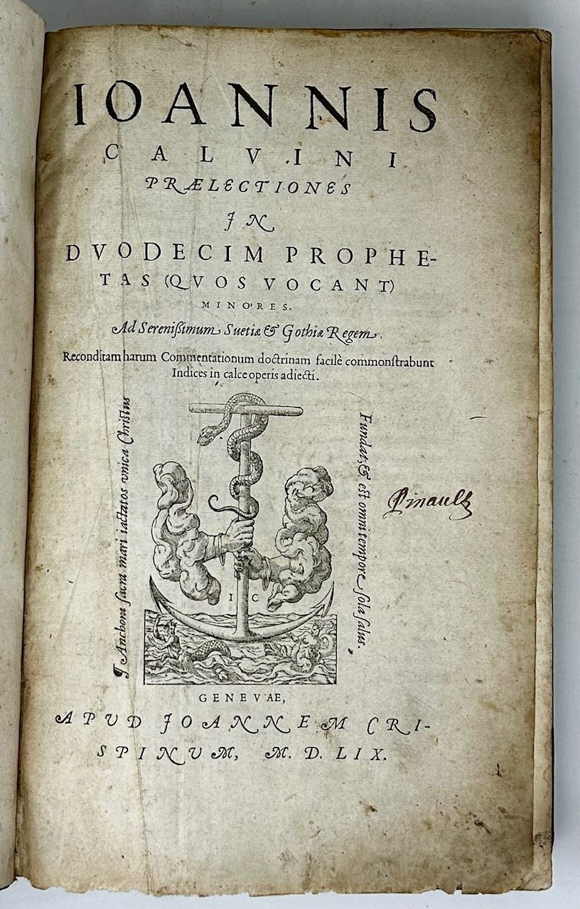 >in-folio (mm 200x325), pp. (12), 795, (37, ult. b.), preziosa leg. del tempo piena pelle con fleuron in oro al centro dei piatti, riquadro a secco con fiore in oro agli spigoli, dorso a nervi con fiore in oro negli scomparti (qualche abile restauro). Impresa tipogr. al tit. ed in fine, testatine ed iniziali silografiche, testo in carattere romano e passi in corsivo. Nelle pagine preliminari si leggono la dedica di Calvin al Re Gustavo e l'avviso ai lettori, ambedue datate 1 febbraio 1559, ed altri due avvisi ai lettori. Prima edizione di questi ampi ed approfonditi commenti ai dodici profeti minori (solo il commento ad Osea era già stato pubblicato nel 1557), scritti esegetici sul Vecchio Testamento tra i più importanti della riforma protestante, perseguiti dall'Inquisizione e messi all'indice, pubblicati vivente l'autore; seppur meno importanti per dottrina, sono sicuramente molto più rari di altre celebri opere di Calvin (Noyon 1509 - Ginevra 1564), tutte condannate dalla Chiesa di Roma. Esemplare molto bello, puro e marginoso (antica firma sul titolo, lievi ingialliture). Dedica al contropiatto superiore datata "8 fevrier 1891" , Erichson, Bibliogr. Calviniana, p. 20. Adams C-303. Manca a BMC, Brunet e Graesse.