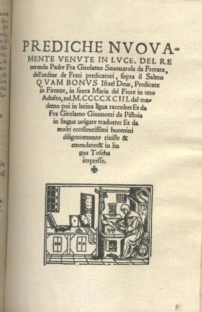 PREDICHE. Nuovamente venute in luce sopra il Salmo "Quam bonus Israel Deus, Predicate in Firenze, in Santa Maria del Fiore in uno Advento, nel MCCCCXCIII dal medesimo in latina lingua raccolte: Et da Frate Girolamo Giannotti da Pistoia in lingua volgare tradotte: Et da molti eccellentissimi huomini diligentemente riunite & emendate: & in lingua Toscha impresse.