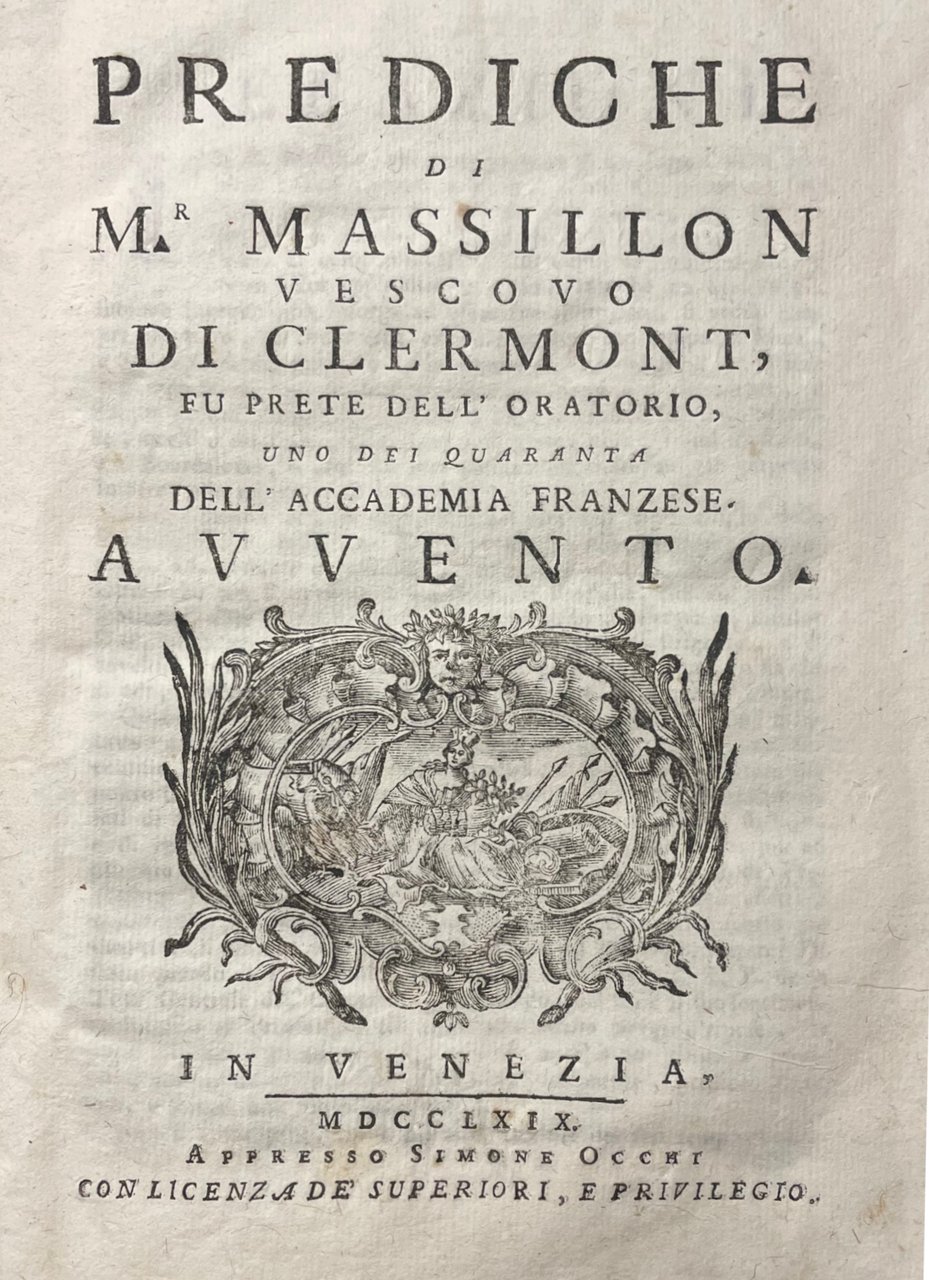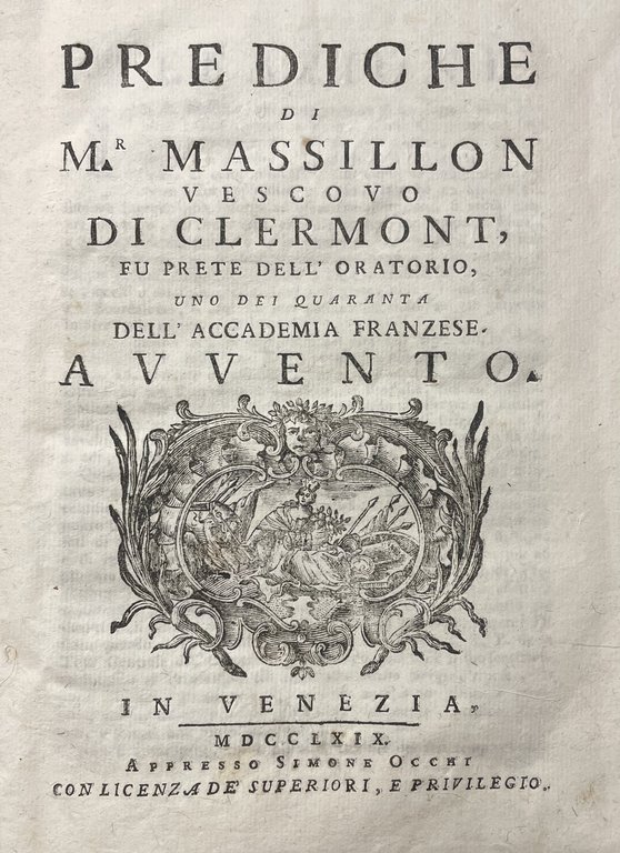 "Di Mr. Massillon vescovo di Clermont, fu prete dell'oratorio, uno dei quarante dell'accademia franzese. Avvento" marca tipografica incisa al frontespizio. in ottavo leg. cart. alla rustica pp. (XII), 160 Buono (Good) Buon es., lievi segni del tempo.