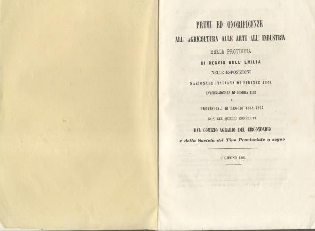 Premi e onorificenze all'agricoltura, alle arti, all'industria, della provincia di Reggio nell'Emilia nelle Esposizioni Nazionale italiana di Firenze 1861, Internazionale di Londra 1862 e Provinciali di Reggio 1862-63.
