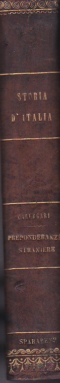 In-8° grande, pp. XIII, 646, legatura coeva m. pelle con titolo, filetti e fregi oro al dorso. Ingialliture marginali. Alcuni timbri di privata appartenenza. Ampio studio, nell'àmbito della 'Storia politica d'Italia scritta da una Società di Professori', sulle lotte di preponderanza tra la Francia e la Spgna relativamente al territorio italiano, sul predominio spagnolo nella penisola e sulle Guerre di Successione che sino alla prima metà del secolo XVIII travagliarono il contesto europeo. Il Callegari, libero docente all'Università di Padova, si occupò fra l'altro, nelle proprie ricerche, della storia di Roma antica, della congiura dei Fieschi, dell'assedio di Torino del 1706.