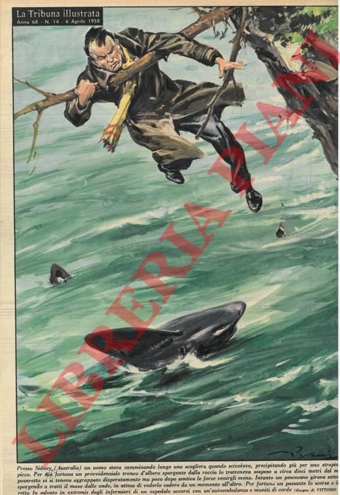 Presso Sidney (Australia) un uomo stava camminando lungo una scogliera quando scivolava, precipitando giù per uno strapiombo a picco. Per sua fortuna un provvidenziale tronco d'albero sporgente dalla roccia lo tratteneva sospeso a circa dieci metri dal mare.Intanto un pescecane girava sotto di lui sporgendo a tratti il viso dalle onde. .