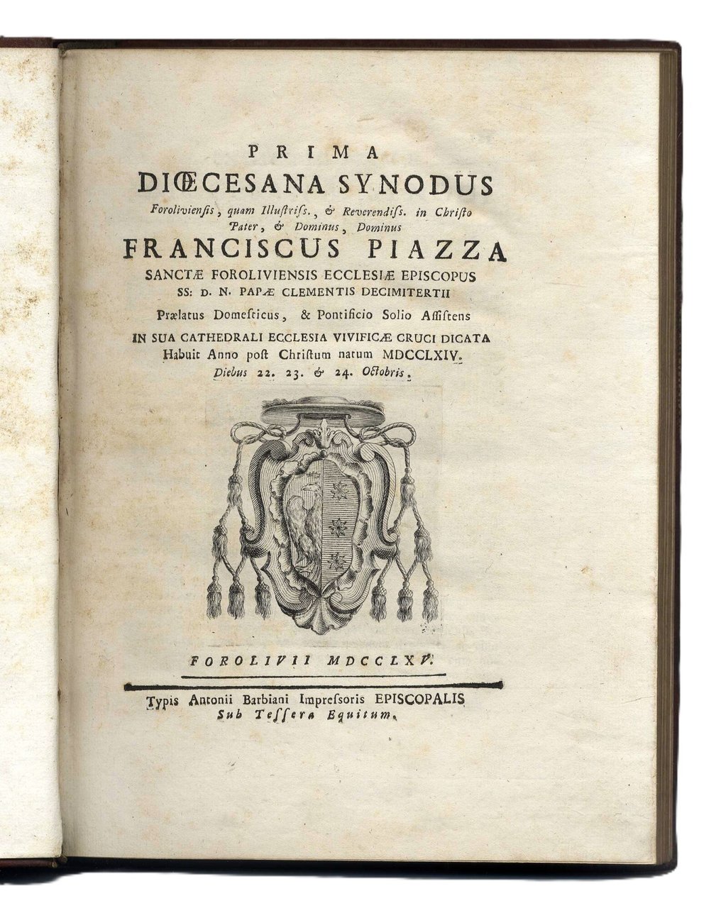 Titolo a stampa con stemma Vescovile di Francesco Piazza (Forlì1707 – 1769) appartenente alla famiglia patrizia forlivese dei Piazza. Fu vescovo dal 1760 e rimase vescovo fino alla morte. Dal 22 al 24 ottobre 1764 celebrò il primo sinodo diocesano.