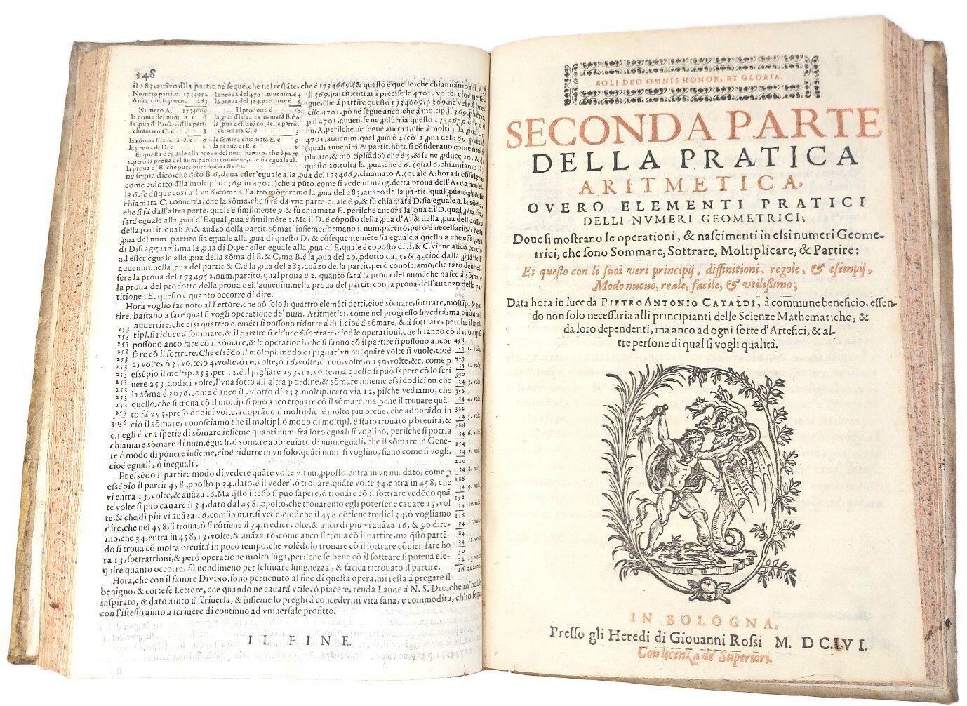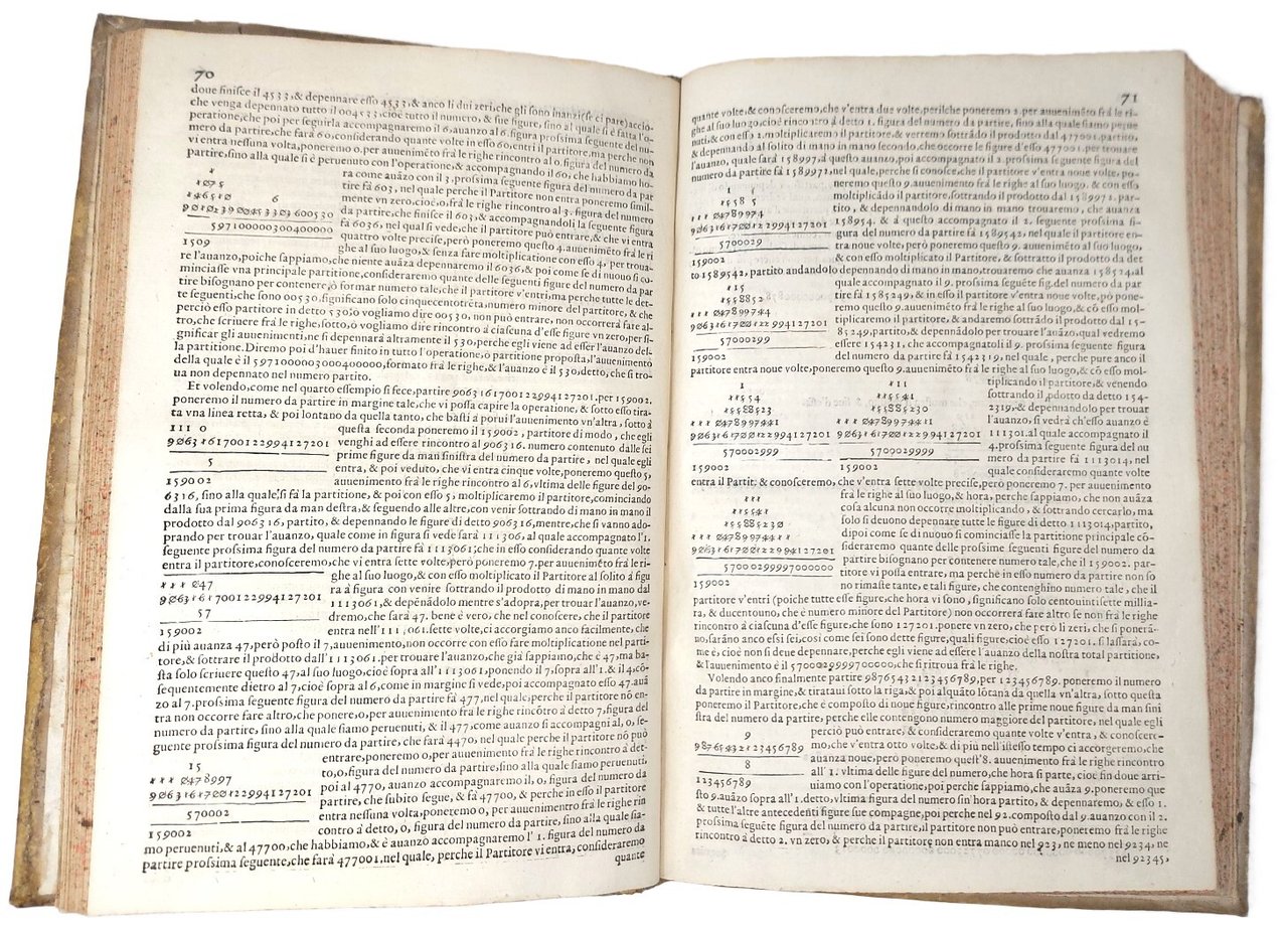 >2 parti in un vol. in-4 (275x180 mm), pp. (12), 148; (4), 151. Legatura coeva in pergamena rigida (lievi difetti alle cerniere), titolo in oro su tassello al dorso, tagli spruzzati. Frontespizio in rosso e nero e bell'impresa dello stampatore sul titolo delle due parti (Ercole e il drago entro ovale). Prime 2 parti (la terza apparve nel 1617 e la quarta nel 1616; cfr. Riccardi 306-7.16 e 17) di quest'opera che secondo Riccardi "è il trattato più completo di aritmetica fino allora pubblicato". Sempre Riccardi avverte che sul primo titolo il nome "Perito Annotio" è anagramma di Pietro Antonio, nome di battesimo del Cataldi ed inoltre che "le opere del Cataldi sono rare e da qualche tempo ricercatissime dai bibliografi", l'edizione è infatti piuttosto rara. Buon esemplare, che reca un curioso errore di stampa (anticamente cassato) nella data nel frontespizio della seconda parte. (Lievissime macchie d'umido ai primi ff.); nota di possesso manoscritta coeva nel primo contropiatto: "ex libris Medici Josephi Ferrero a Plolsasco, 1613". Riccardi 302.4 e 304.8. BMC, XVII sec., 207.