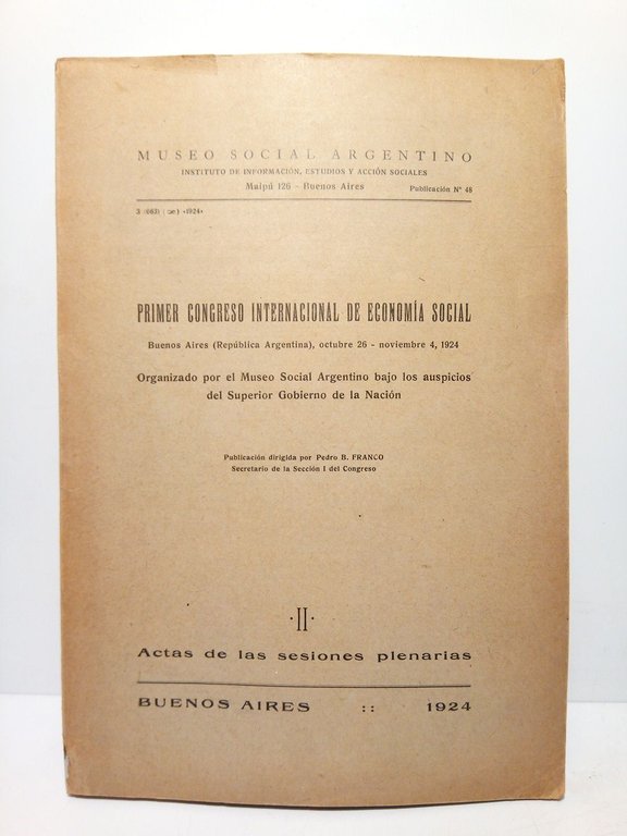 Primer Congreso Internacional de Economía Social, Bueno Aires (República Argentina), octubre 26 - noviembre 4, 1924. Ooganizado por el Museo Social Argentino bajo los auspicios del Superior Gobierno de la Nación: II actas de las sesiones plenarias. (Resoluciones sancionadas) / Publicación dirigida por Pedro B. Franco