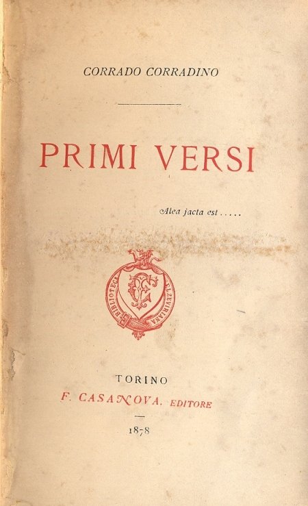 In 16°, piena tela, pp. XI + 209 + cc.nn. 9 di catalogo. Carta forte. Prima edizione. Poesie d'imitazione carducciana e scapigliata.