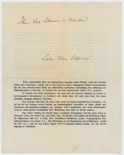 Large 4to. 2 pp. on bifolium. Addenda. An invitation for the first Bayreuth Festival ever (held in 1876), mistakenly addressed "Herrn Carl Schlosser, in München. | Lieber Herr Schlosser!", but intended for the German tenor Max Schlosser who was to sing the part of Mime.