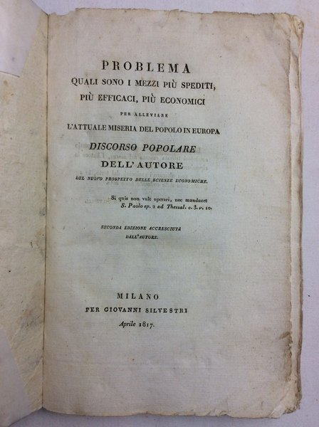 PROBLEMA: QUALI SONO I MEZZI PIU' SPEDITI PIU' EFFICACI PIU' ECONOMICI PER ALLEVIARE L'ATTUALE MISERIA DEL POPOLO IN EUROPA. - Discorso popolare dell'autore del Nuovo prospetto delle scienze economiche. Seconda edizione accresciuta dall'A.