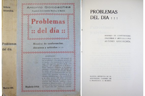 Madrid, Imprenta de "El Mentidero", 1916. 4to.; 345 pp. Cubiertas originales. Entre otras "cuestiones del día", el que fuera Presidente de la Juventud Maurista, trata en este libro de el "habeas corpus" y las ejecuciones en Irlanda, el nacionalismo catalán, el militarismo y la actividad política obrera, además de un extenso artículo sobre "Los deberes sociales de la mujer".