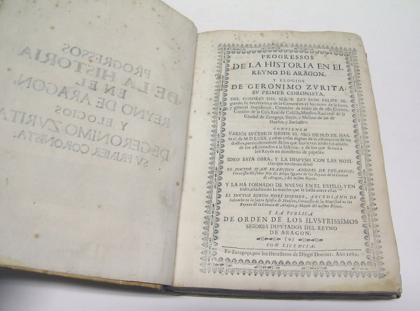 Progressos de la Historia en el Reyno de Aragón , y elogios de Geronimo Zurita, su primer coronista. Contienen varios sucessos desde el año de M.D.XII hasta el de M.D.LXXX . Iideó esta obra Iuan Francisco Andres de Uztarroz, y la ha formado de nuevo en el estilo y en todo, añadiendo lo mucho que se halla entre estas, Diego Iosef Dormer, y la publica de orden de los Ilustrissimos Señores Diputados del Reyno de Aragon.