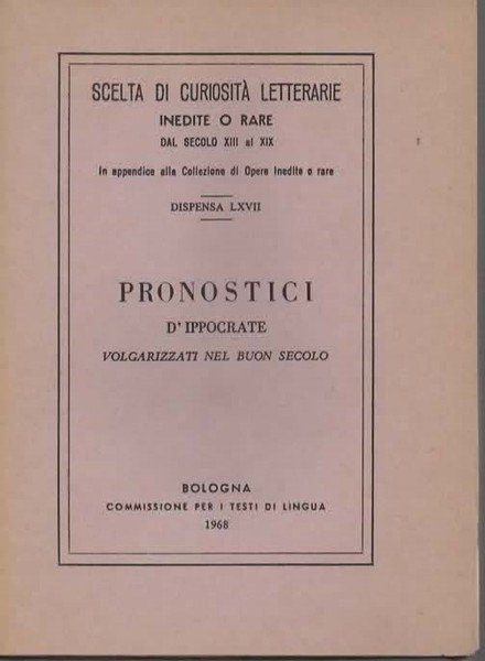 In 16°, br. edit., pp. 67,(1),75,(1). Di seguito ai Pronostichi: Della scelta di curiostà letterarie inedite o rare (di Carducci). Ristampa anastatica della disp. LXVII della "Scelta di curiosità letterarie inedite o rare dal secolo XIII al XIX"